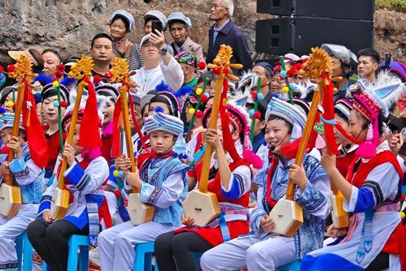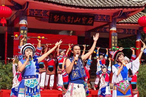 图为8月30日,大理白族自治州剑川县石宝山景区,身着民族服饰的年轻人们在2024年石宝山歌会上表演。(云南网)