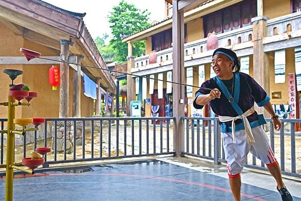 图为近日,“白裤瑶打陀螺”代表性传承人在南丹县里湖瑶族乡朵努社区表演花样陀螺。(新华社)