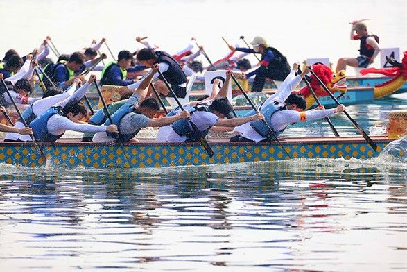 图为8月31日,来自清华大学、北京大学、山东大学、南开大学等12所中国知名高校的龙舟队展开激烈角逐。(中新社)