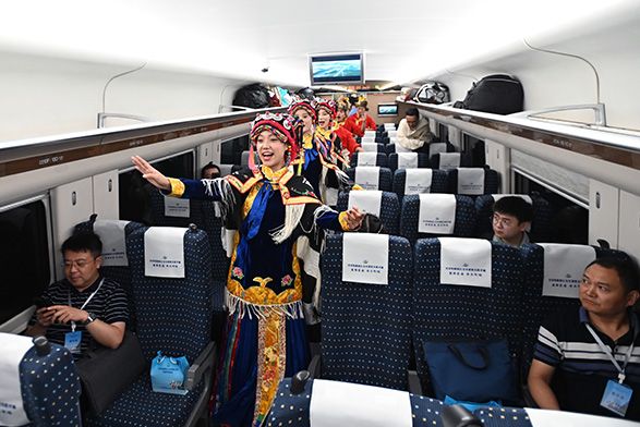 图为8月30日,藏族青年在新建四川成都至青海西宁铁路镇江关至黄胜关段通车仪式上表演。(中新社)