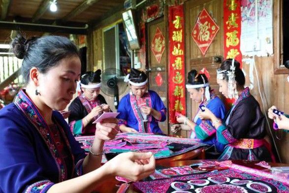 图为近日,广西三江侗族自治县同乐苗族乡同乐村寨从屯,侗乡妇女在制作侗族刺绣产品。(中新社)