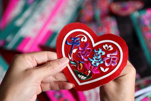图为侗乡妇女展示侗族刺绣产品。(中新社)