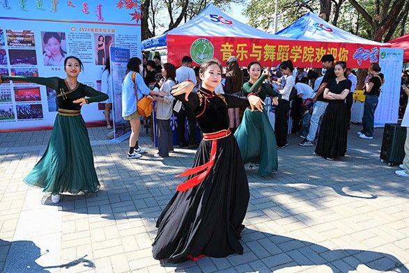 图为8月30日,内蒙古高校迎来开学季,学生表演蒙古族舞蹈欢迎新同学。(中新社)