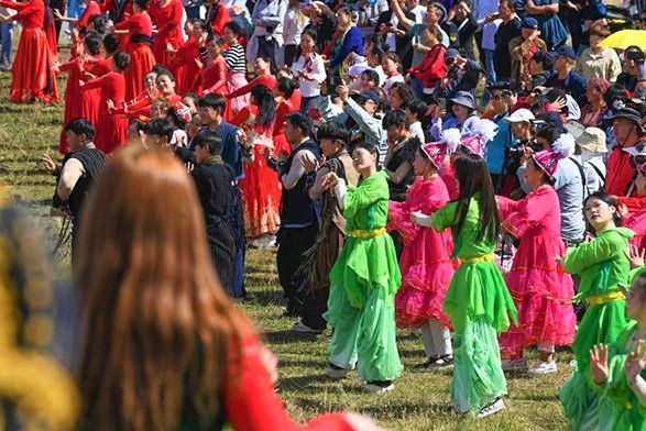 图为8月31日,乌鲁木齐南山风景区乌拉斯台草原,2024年乌鲁木齐文化旅游消费季暨“南山牧场 马上音乐汇”活动举行,演员和观众在活动中一起跳起民族舞蹈“黑走马”。(新华社)