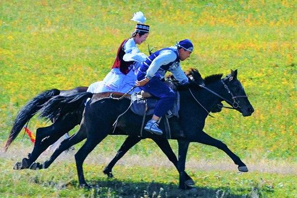 图为8月31日,乌鲁木齐南山风景区乌拉斯台草原,2024年乌鲁木齐文化旅游消费季暨“南山牧场 马上音乐汇”活动举行,演员在活动中展示民俗活动“姑娘追”。(新华社)