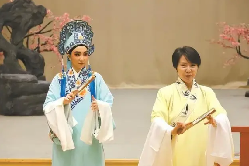 在越剧院排练厅,上海越剧院院长吴巍、越剧推广人沈歆雯的一番介绍打开了年轻人的好奇心。随着古典音乐响起,越剧演员俞景岚、郭茜云表演了《红楼梦•读西厢》片段。