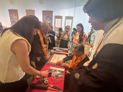 为了让观众更深入理解唐卡艺术的独特魅力,本次展览还设置了互动区域。参观者在仁青才让先生的指导下,通过使用天然矿石颜料亲手绘画,深入体验了唐卡的制作过程。