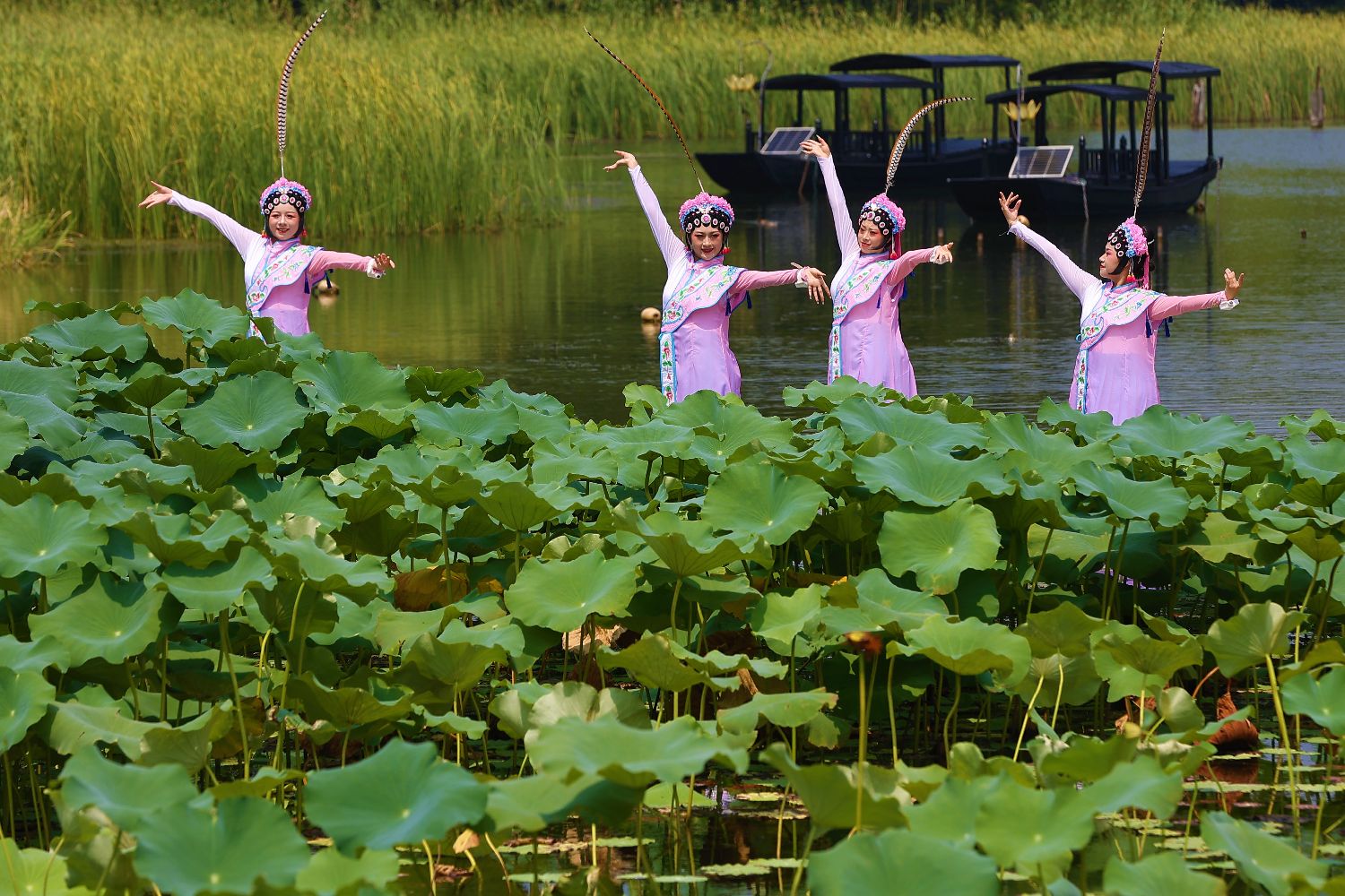 图为7日,江苏无锡,“拈花有戏·无界”拈花湾第二届戏曲生活季在无锡拈花湾启幕,演员在荷花边表演戏曲节目。(中新社)