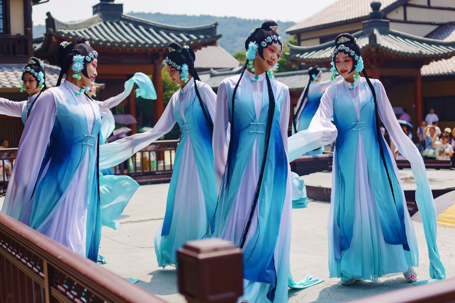 图为7日,江苏无锡,“拈花有戏·无界”拈花湾第二届戏曲生活季在无锡拈花湾启幕,身着青色戏服的演员们正在表演戏曲节目。(中新社)