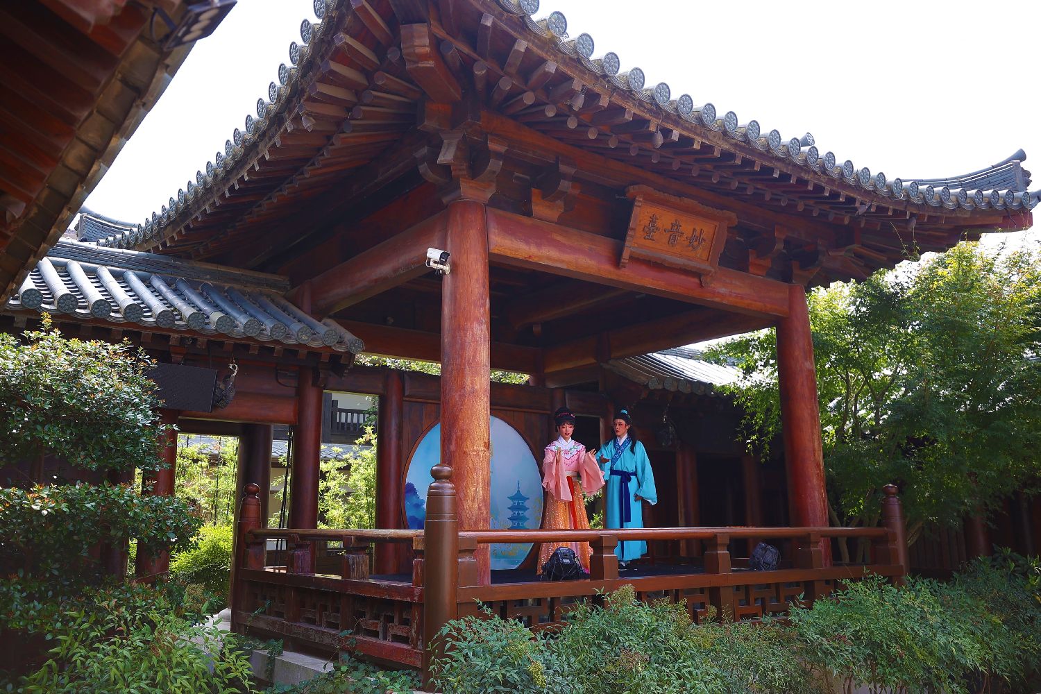 图为7日,江苏无锡,“拈花有戏·无界”拈花湾第二届戏曲生活季在无锡拈花湾启幕,演员在亭台楼阁表演戏曲节目。(中新社)