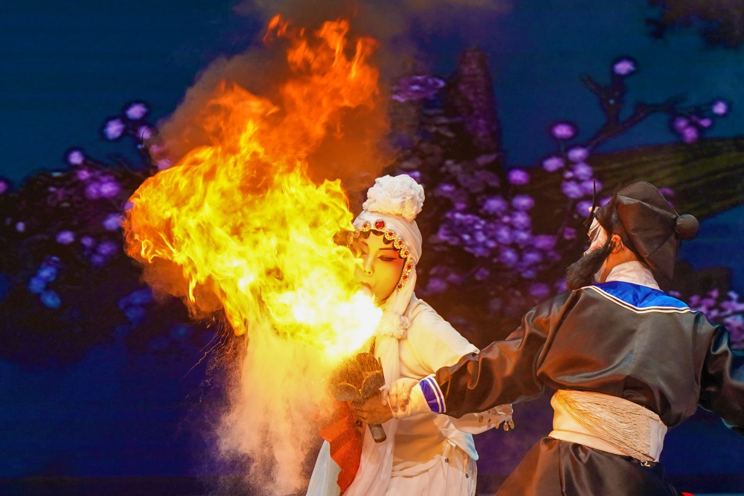 近期中国各地戏曲活动精彩纷呈,传统艺术焕发魅力。舞台上的精湛表演、美妙旋律,让观众沉浸在戏曲的美妙世界之中。图为当地时间9日晚,贵州花灯戏《月照枫林渡》在贵阳上演,该剧以贵州酒文化为背景,在剧情结构和舞台表现上展现了贵州花灯戏的独特魅力。(中新社)