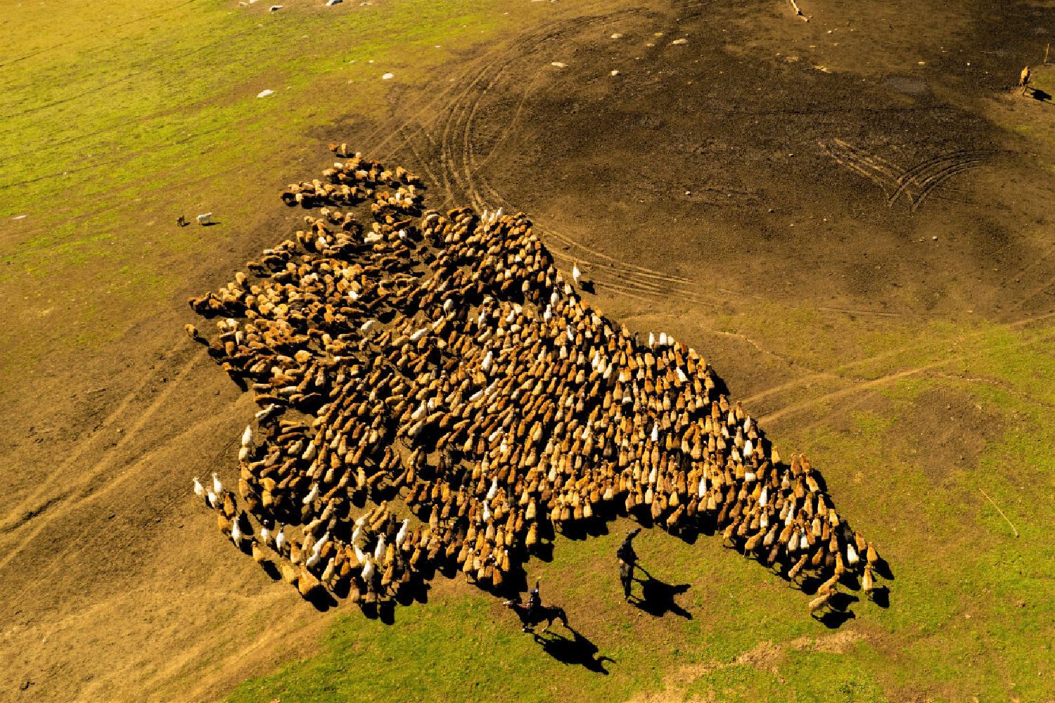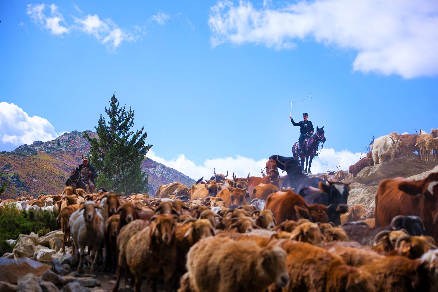 近期,中国各地的游牧民族活动丰富多彩,展现了他们独特的生活方式和丰富的文化传统。在新疆阿勒泰地区,每年秋季都会进行大规模的牧群转场,这是游牧民族的古老传统,不仅是对自然规律的尊重,也是对牧民生活方式的传承。图为护牧小分队民警帮助牧民驱赶牲畜。(CFP)