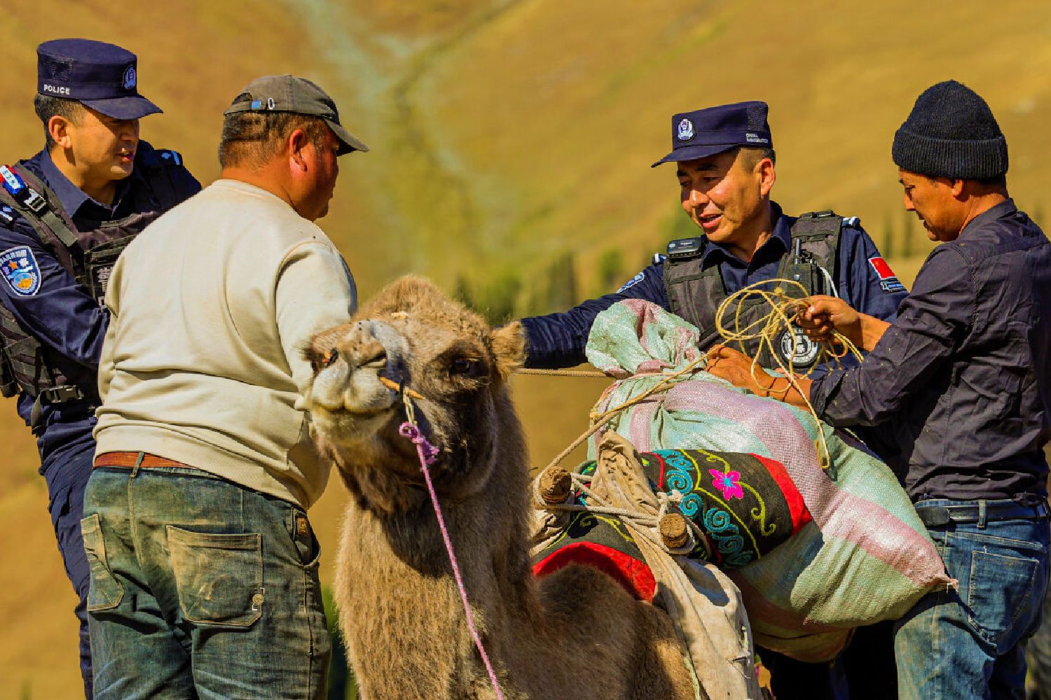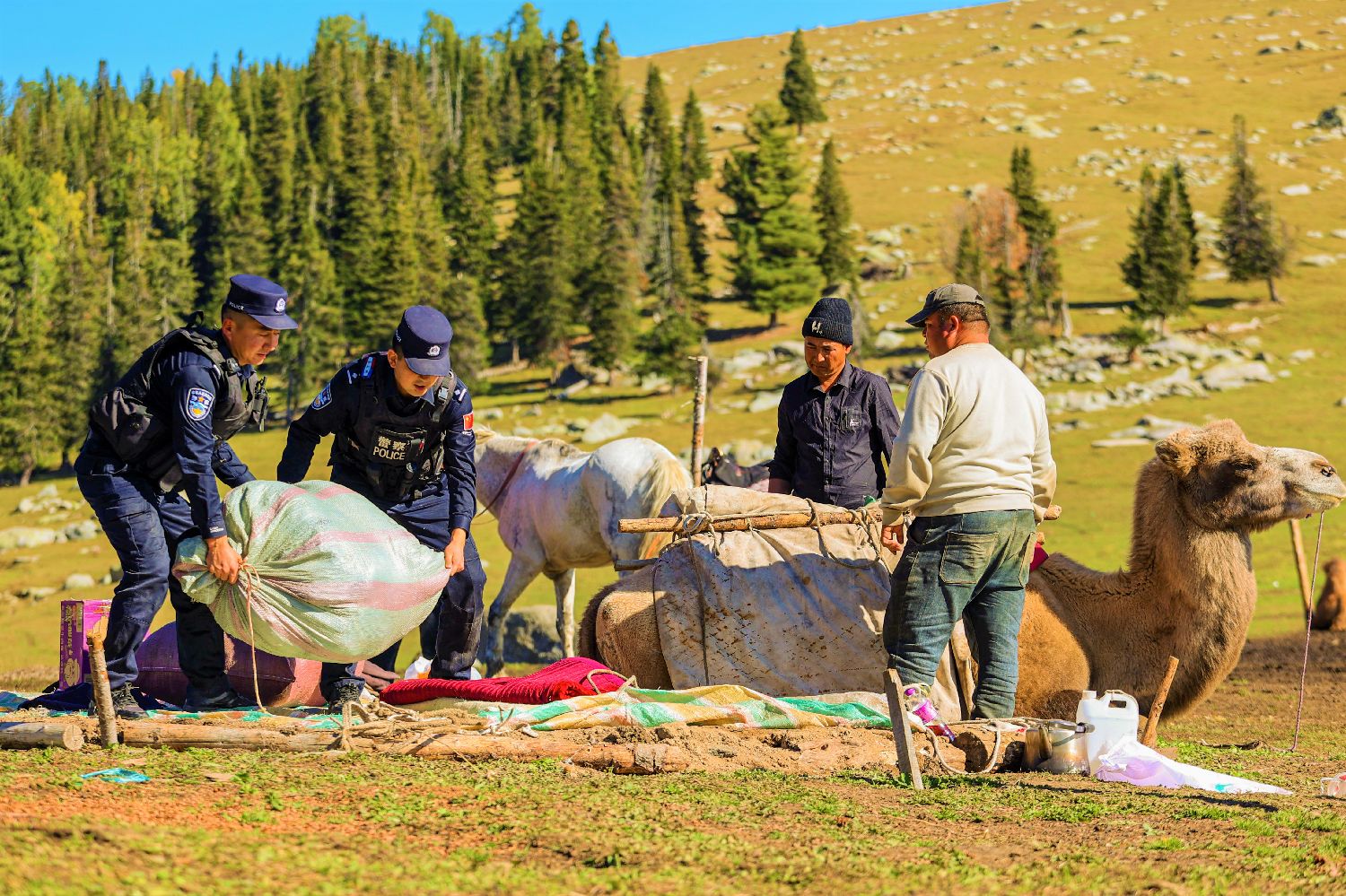 图为10日,新疆阿勒泰,禾木边境派出所民警帮助牧民打包物资,及时转场。(CFP)