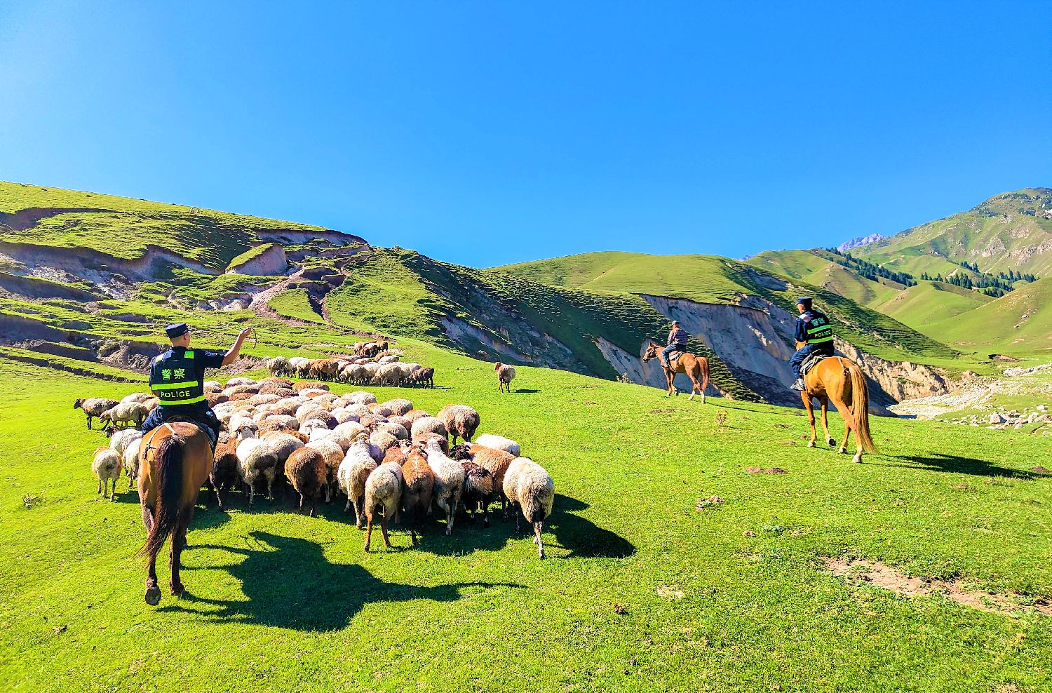 图为8日,新疆伊犁,民警正在帮助牧民进行羊群转场。(CFP)