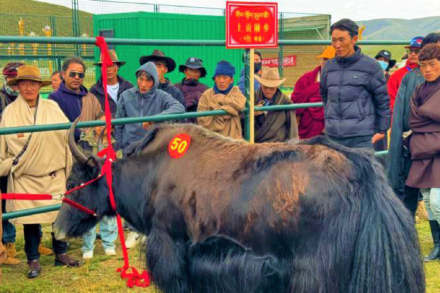 图为11日,青海三江源腹地举办“牦牛雅赛”,农畜专家对参赛种牛进行外观评分。(中新社)