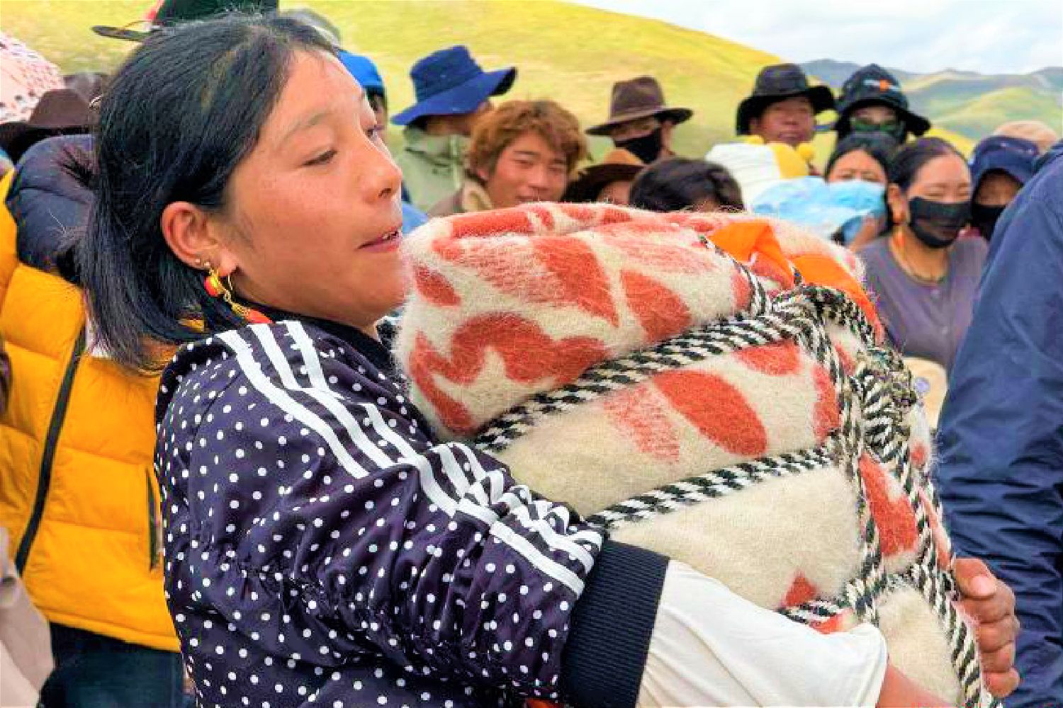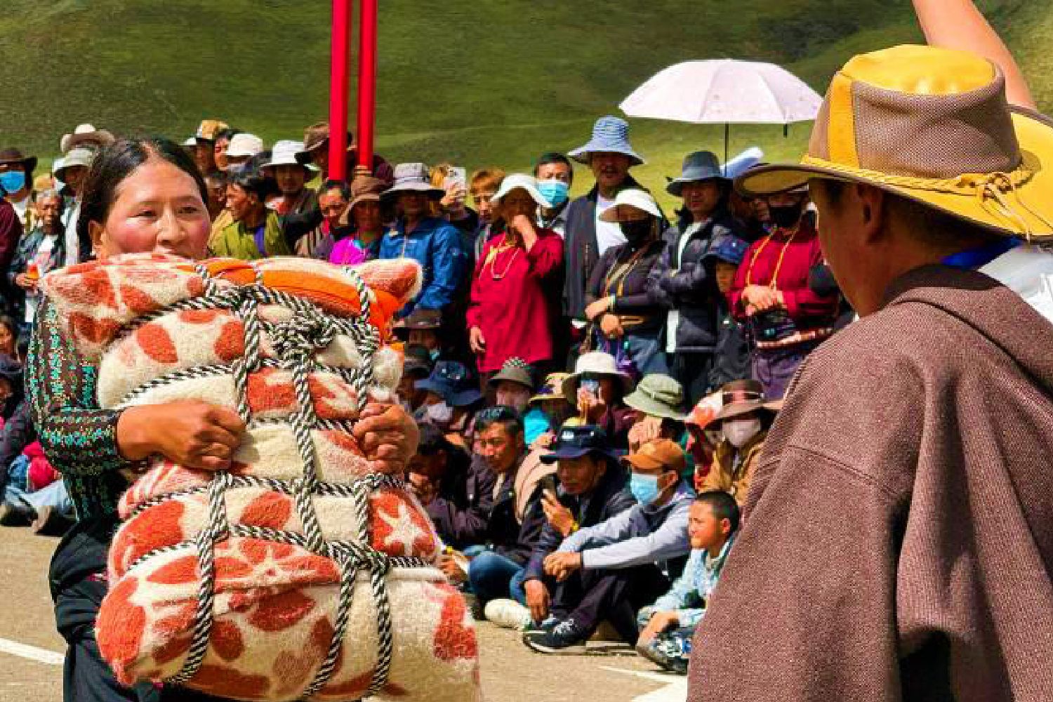图为11日,青海省果洛藏族自治州甘德县举办民族传统体育赛事——抱沙袋比赛,比赛中的女选手。(中新社)