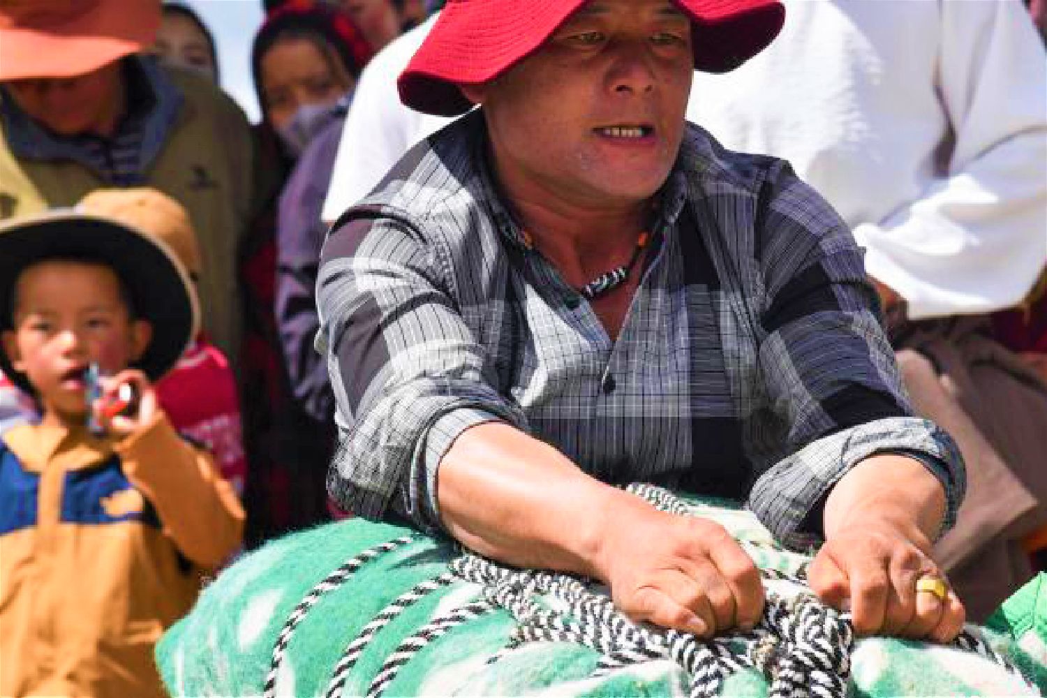 图为11日,青海省果洛藏族自治州甘德县举办民族传统体育赛事——抱沙袋比赛,现场观众围观比赛。(中新社)