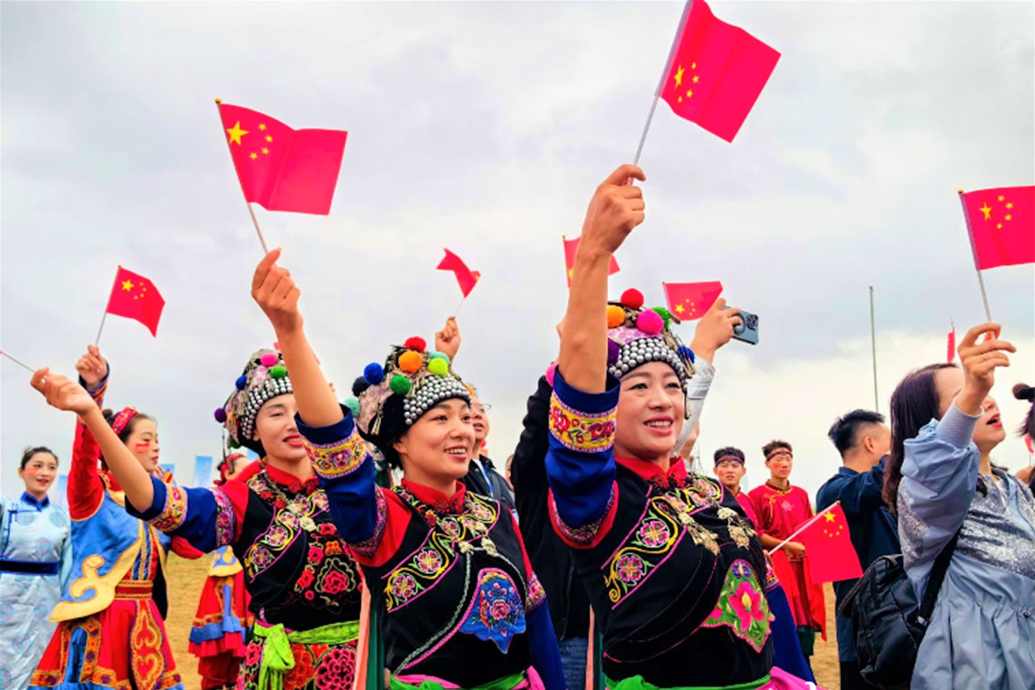 图为开幕式现场欢呼雀跃的民众。(内蒙古新闻网)