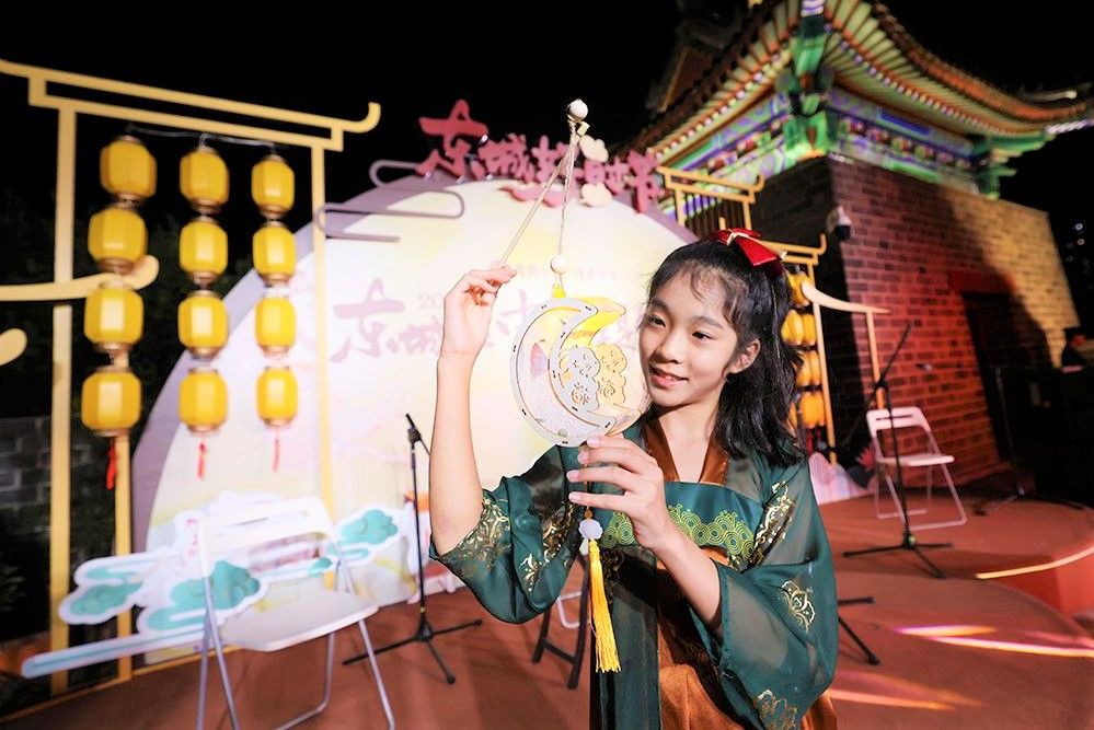 图为9月14日晚,“月圆京城 情系中华”2024东城区中秋诗会在左安门角楼举办,小朋友展示“月兔同笼”小提灯。(新京报)