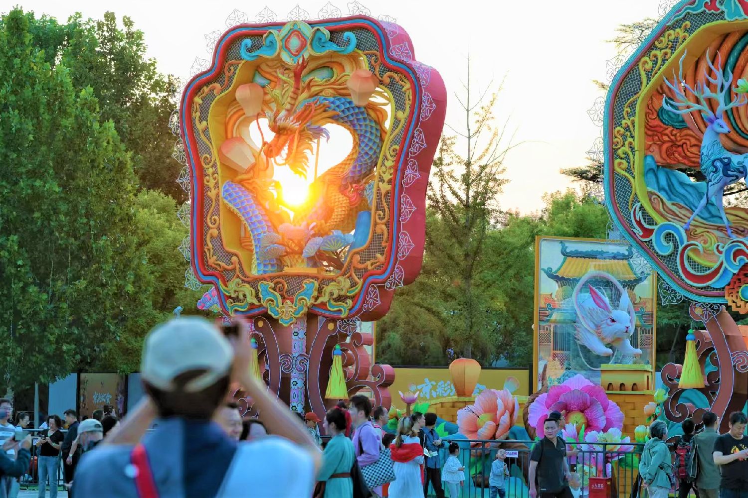 图为9月15日,丰台区2024年“卢沟晓月”中秋系列文化活动在北京园博园三号门广场正式启幕。现场精心打造一片梦幻般的“打卡装置区”,展板上的圆月里两只兔子互相追逐嬉戏,一只“卧龙”遥望圆月。(新京报)