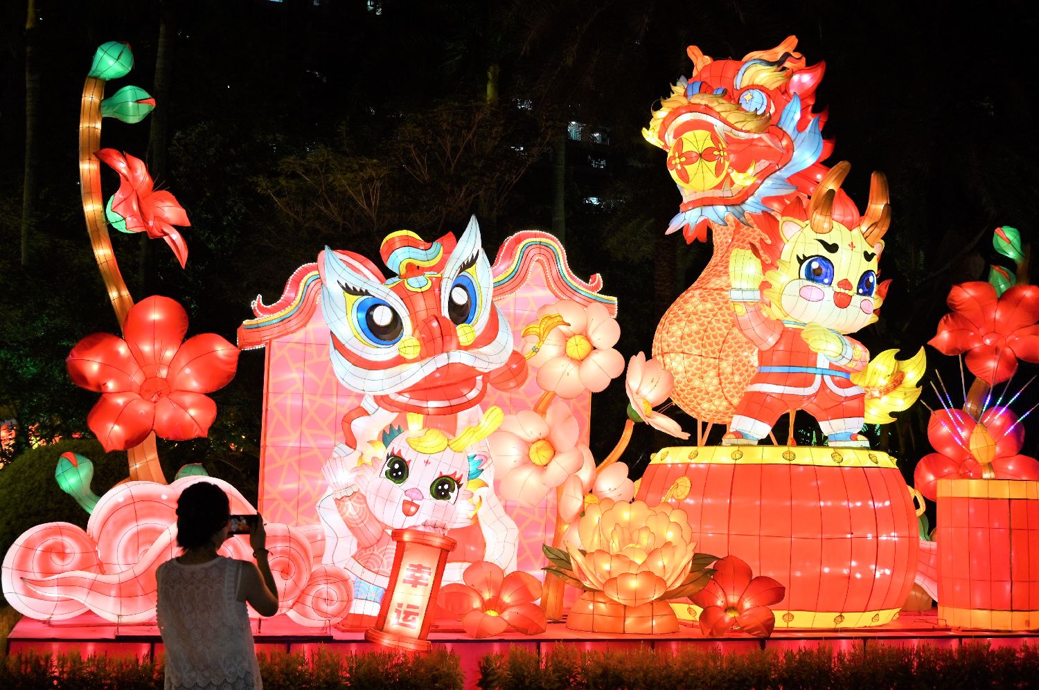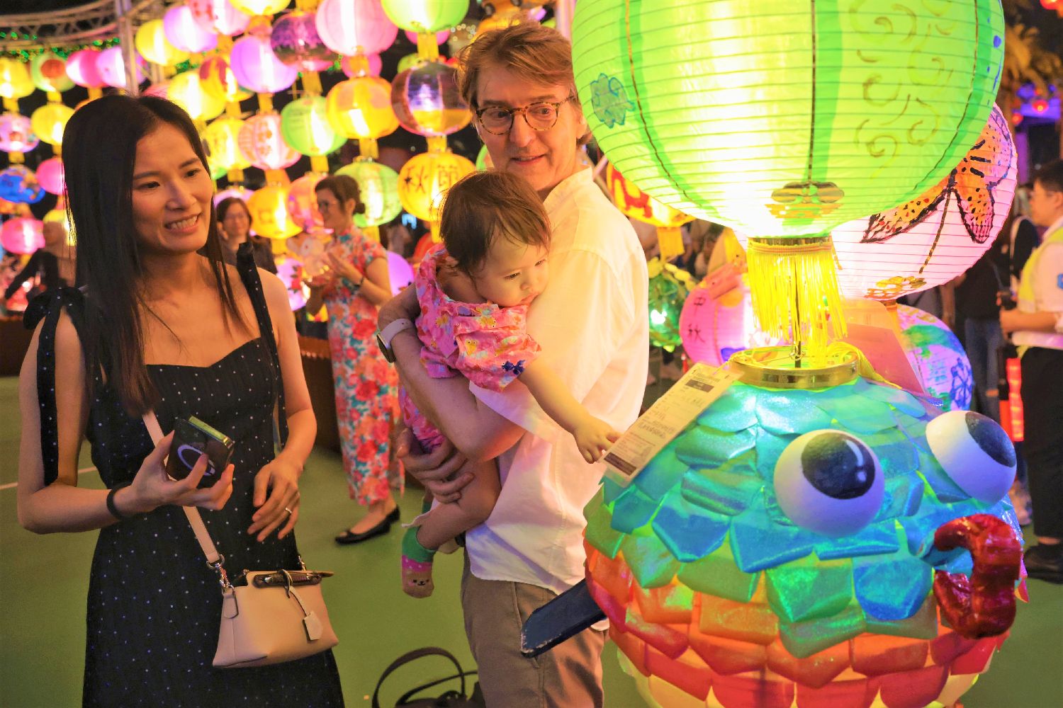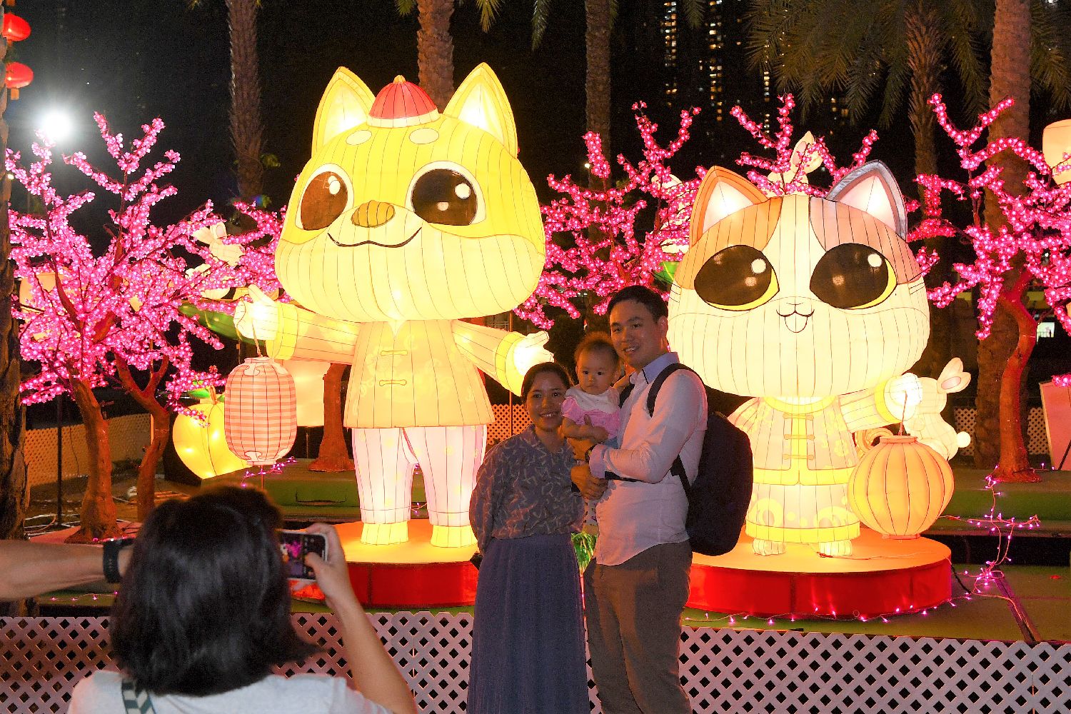 图为9月12日,以“国风·港味”为主题的中秋彩灯会在香港维多利亚公园亮灯,迎接中秋节和国庆节,观众在彩灯会上留影。(新华社)