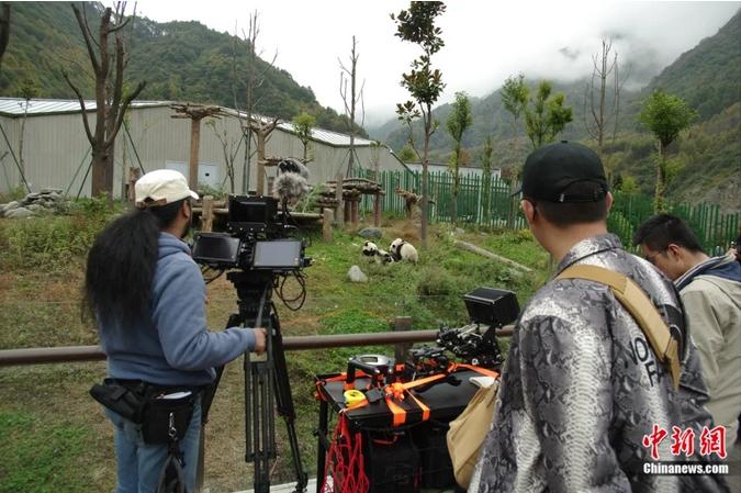 盐滨雅之(左一)在卧龙大熊猫繁育中心拍摄。(图/中新网)