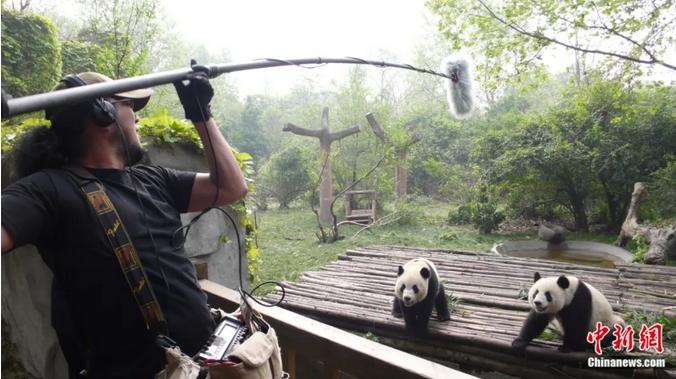 盐滨雅之在成都大熊猫繁育研究基地对大熊猫的声音进行录音。(图/中新网)