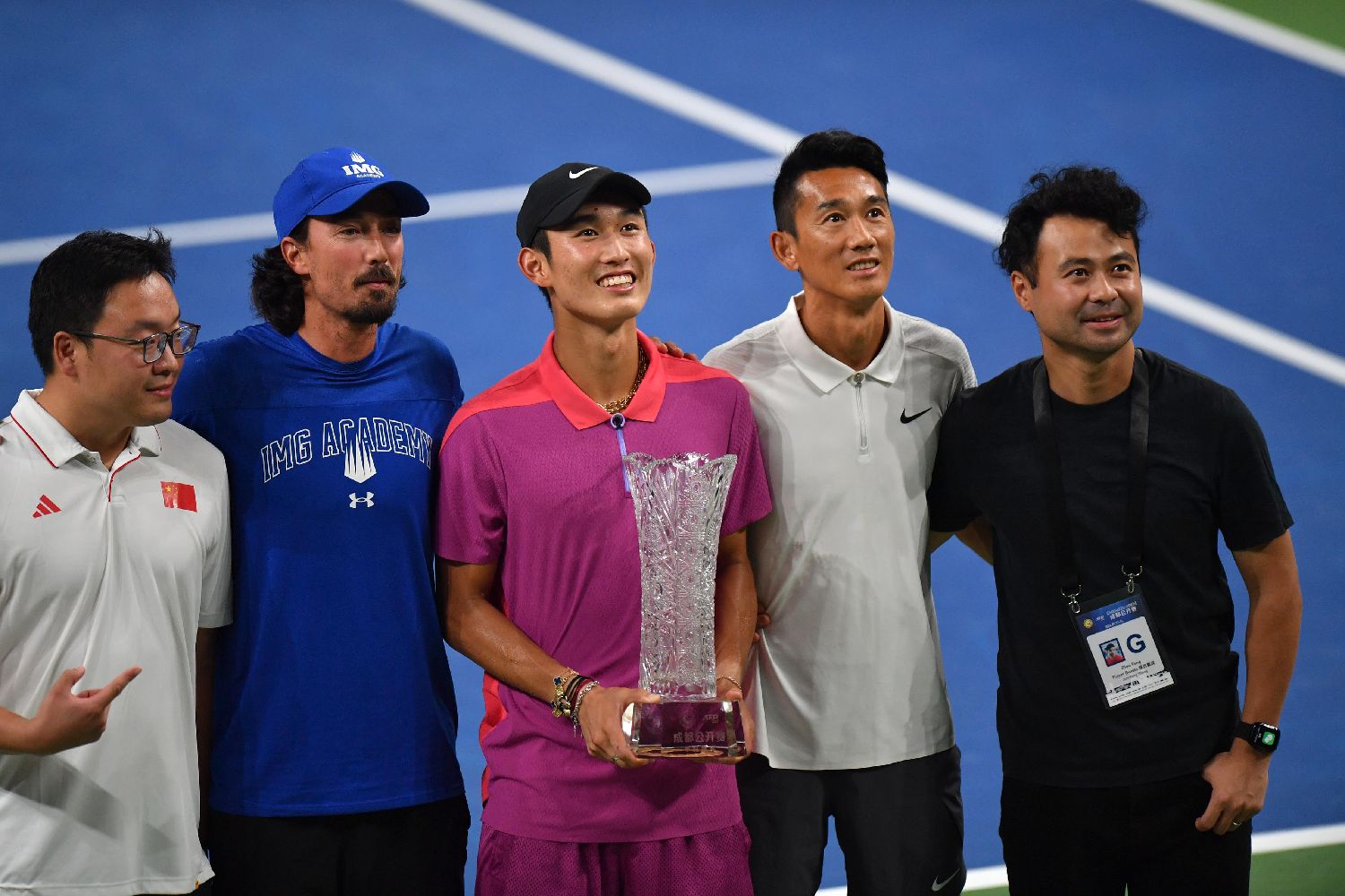 9月24日,在男子职业网球选手协会(ATP)250成都公开赛男单决赛中,中国选手商竣程夺得冠军。图为商竣程拿着奖杯与其父亲、前足球运动员商毅(右二)等人合影。(图/中新社)