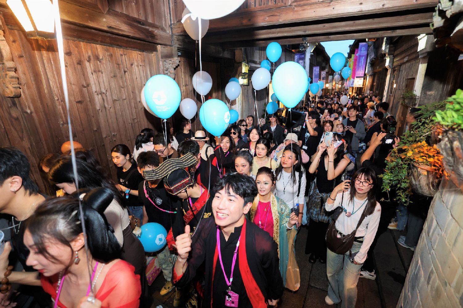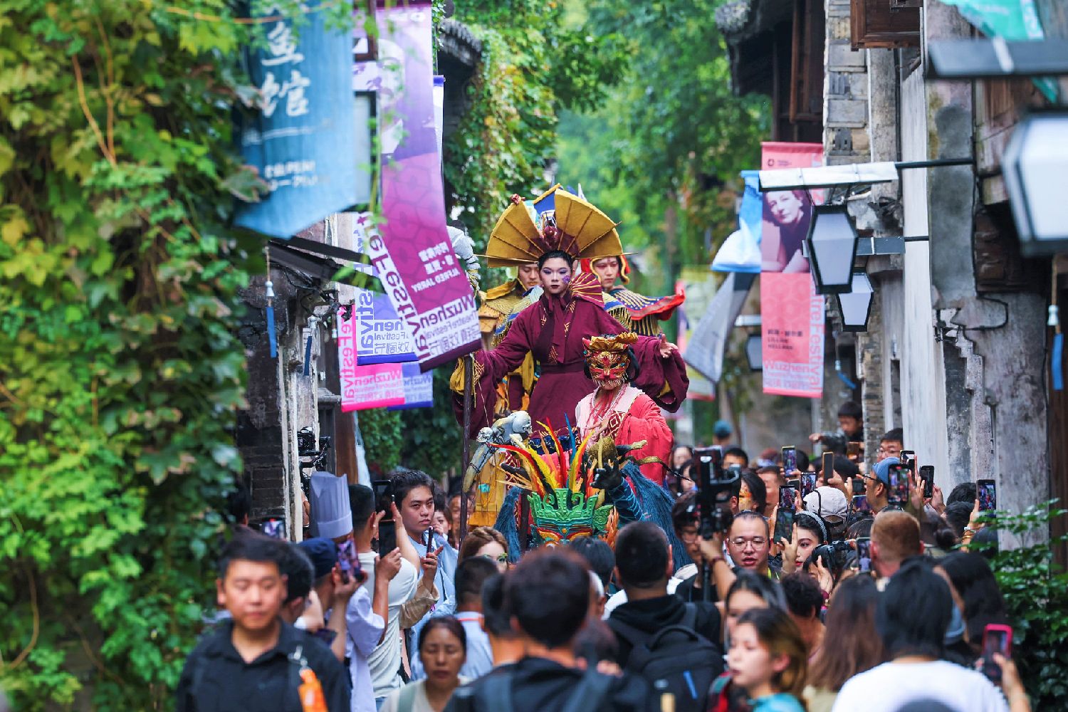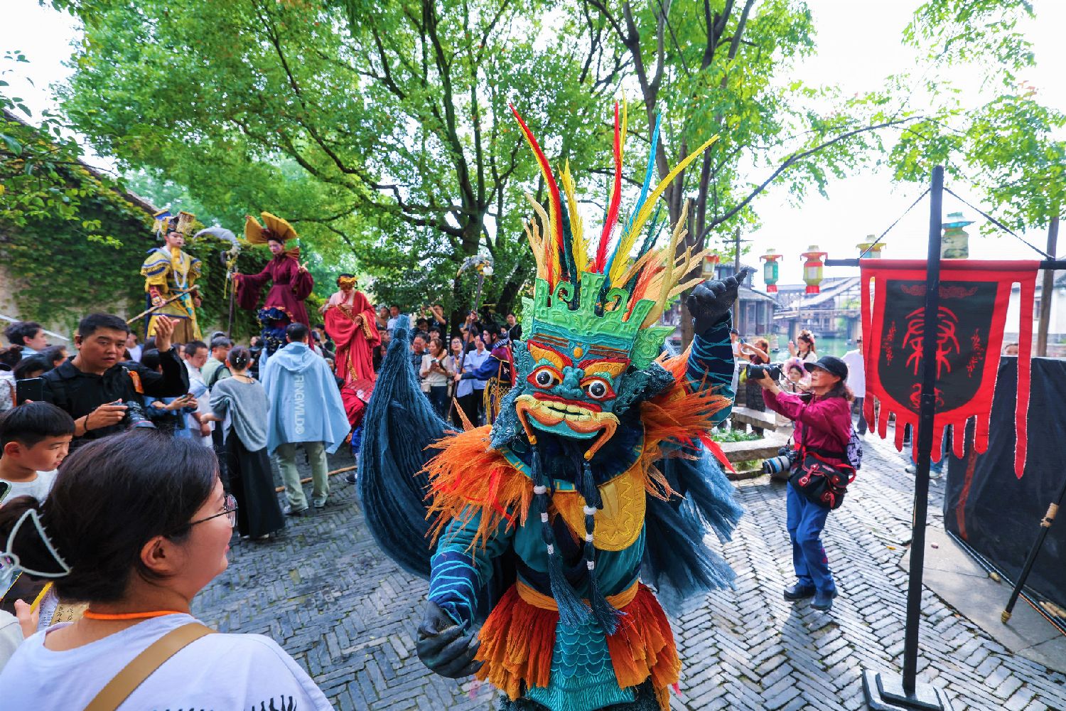 10月17日,第十一届乌镇戏剧节在浙江省桐乡市乌镇开幕。本届活动以“如磐”为主题,汇聚特邀剧目、青年竞演、古镇嘉年华、小镇对话、戏剧集市、戏梦粮仓六个单元,来自11个国家的24部特邀剧目演出。图为10月17日,古镇嘉年华上,巡游演出的队伍与游客们一起走遍西栅的街头巷尾。(CFP)