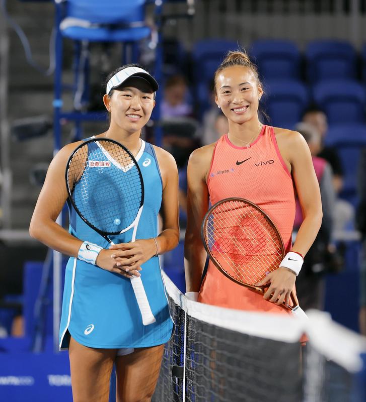 10月24日,中国选手郑钦文(右)和日本选手内岛萌夏在赛前合影。(图/新华社)