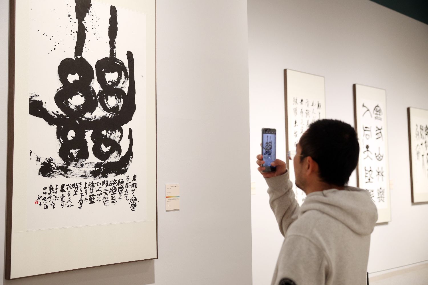 2024年11月12日,日本书法家浅田圣子的书法作品《继》吸引参观者驻足拍摄。(黎明 摄)