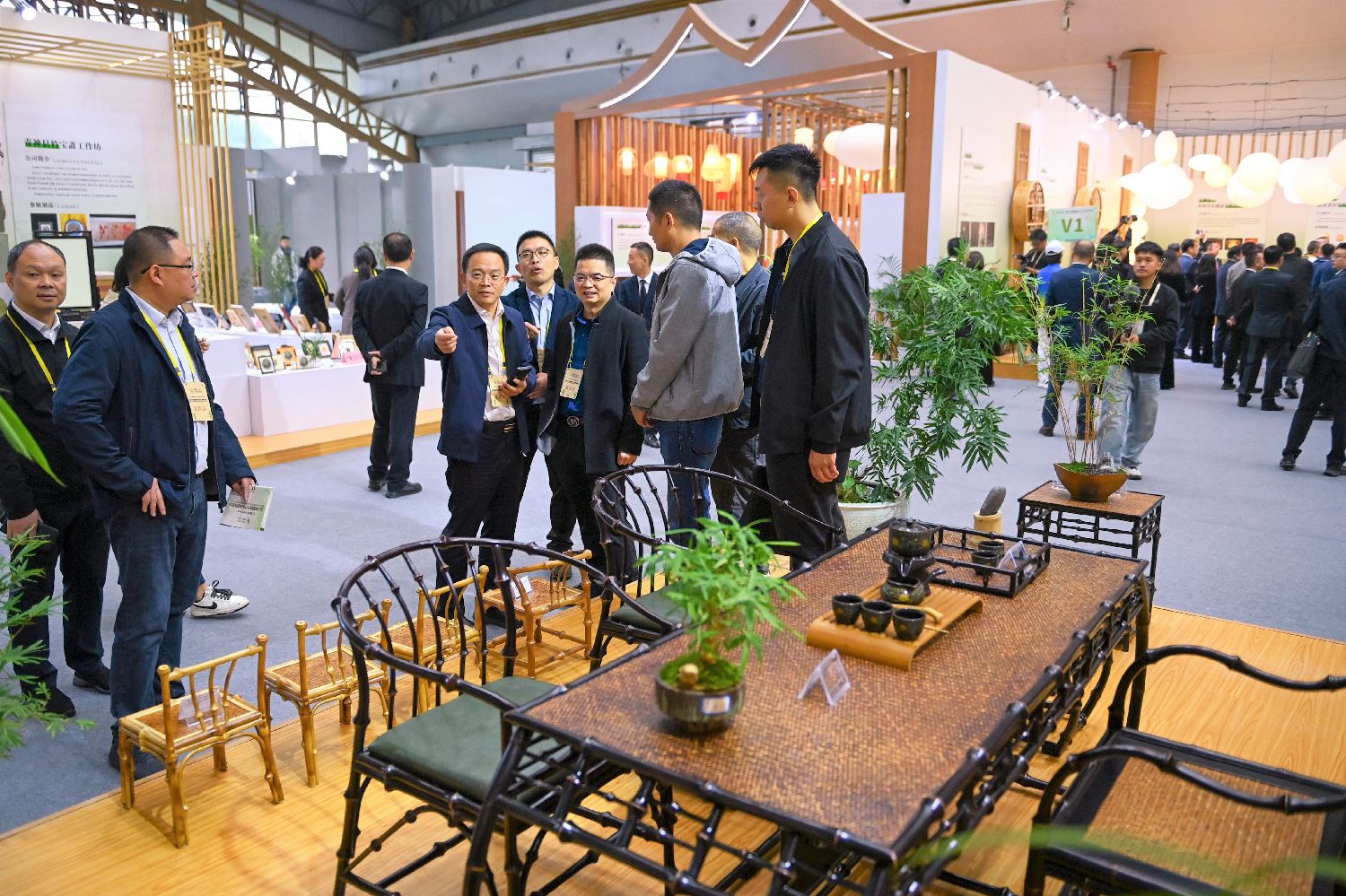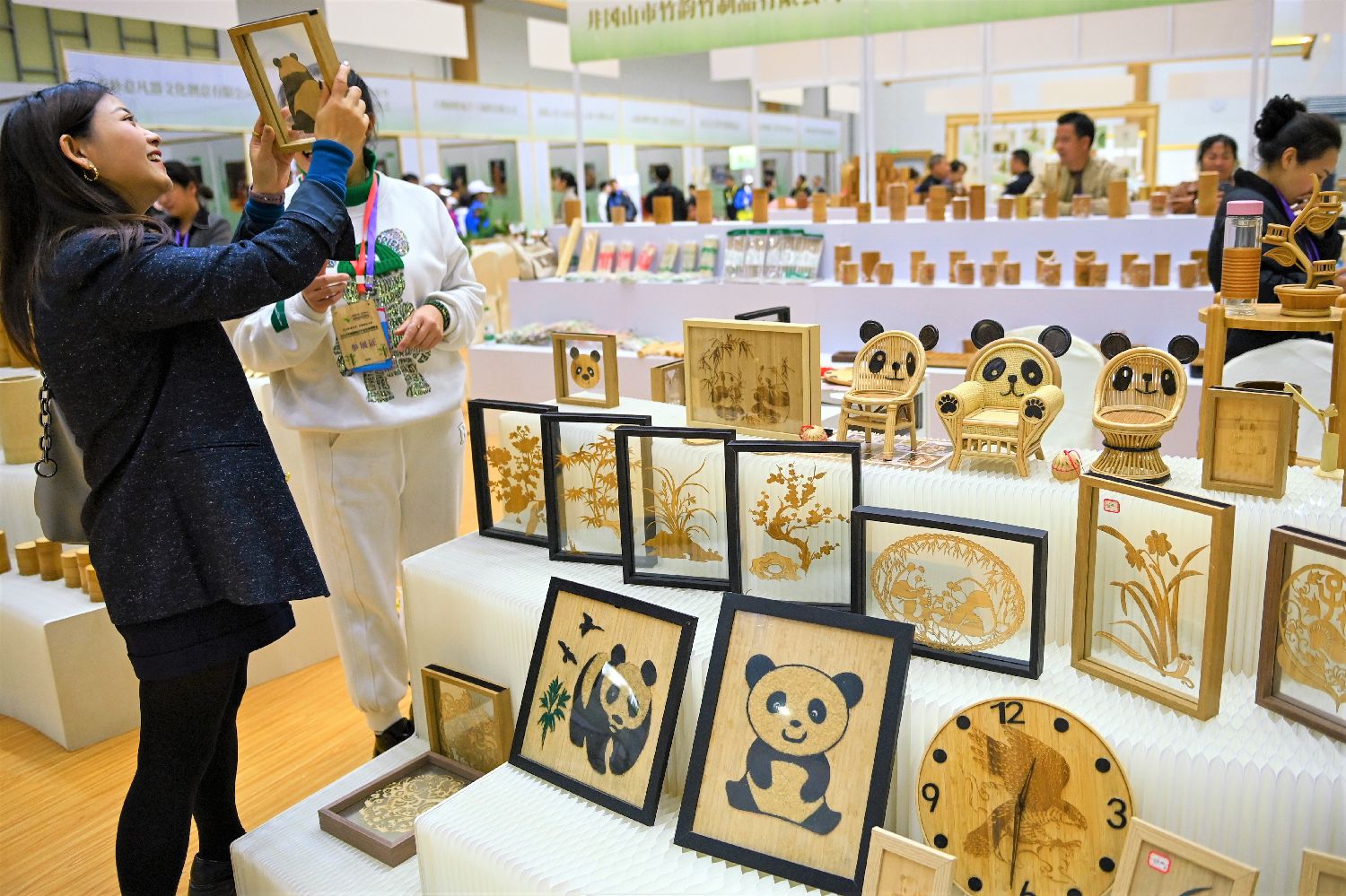 图为11月11日,四川青神,竹博会活动现场,竹子家居产品吸引参观者驻足。(中新社)