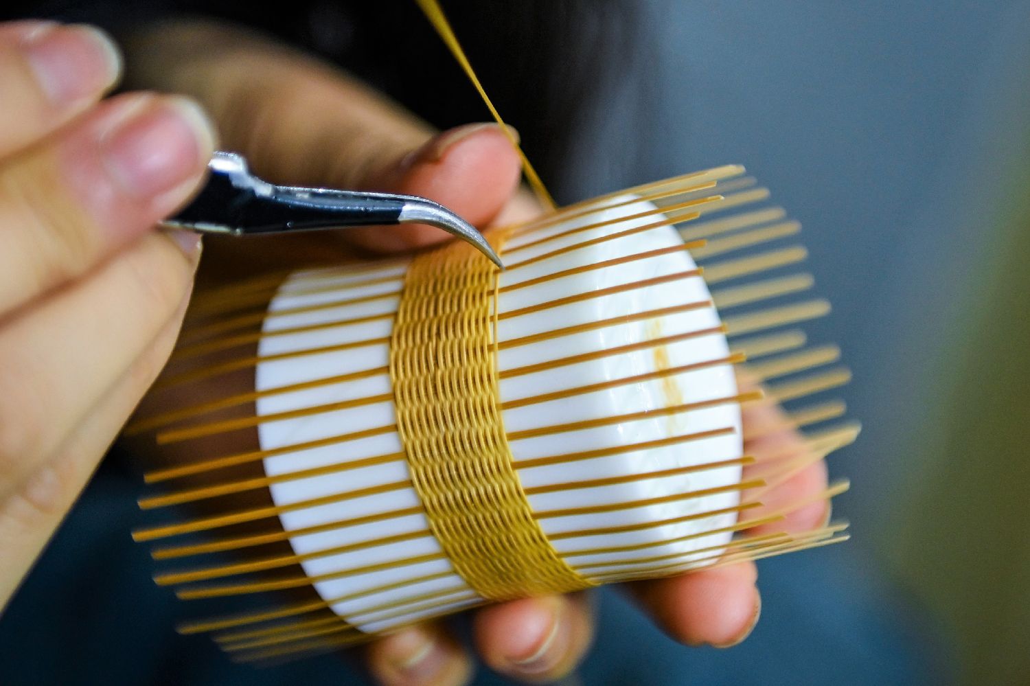 图为11月11日,四川青神,竹博会活动现场手艺人展示瓷胎竹编技艺。(中新社)