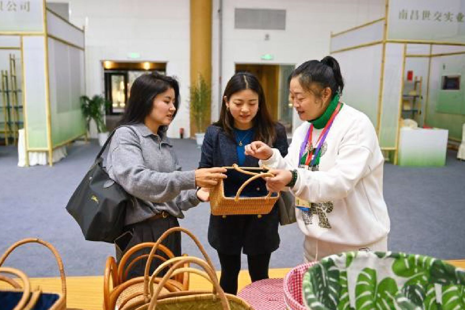 图为11月11日,四川青神,竹博会活动现场,藤编手提包吸引参观者。(中新社)