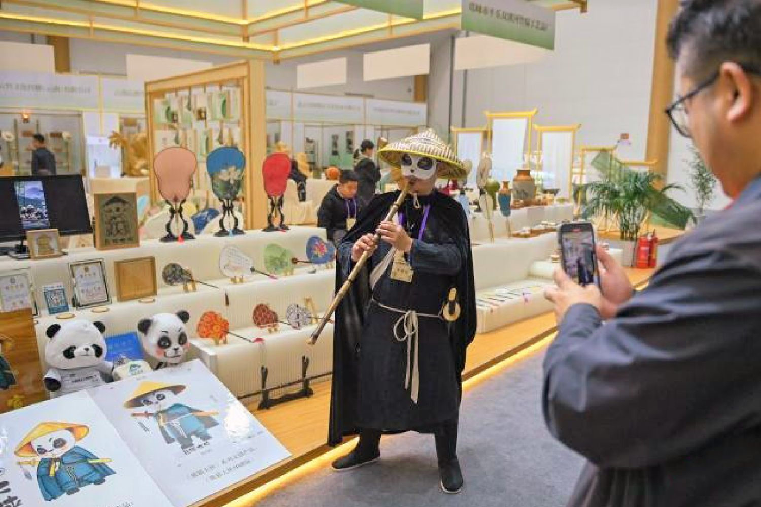 图为11月11日,四川青神,竹博会活动现场,展台前张伟装扮成“熊猫”大侠并展示自己的文创产品。(中新社)