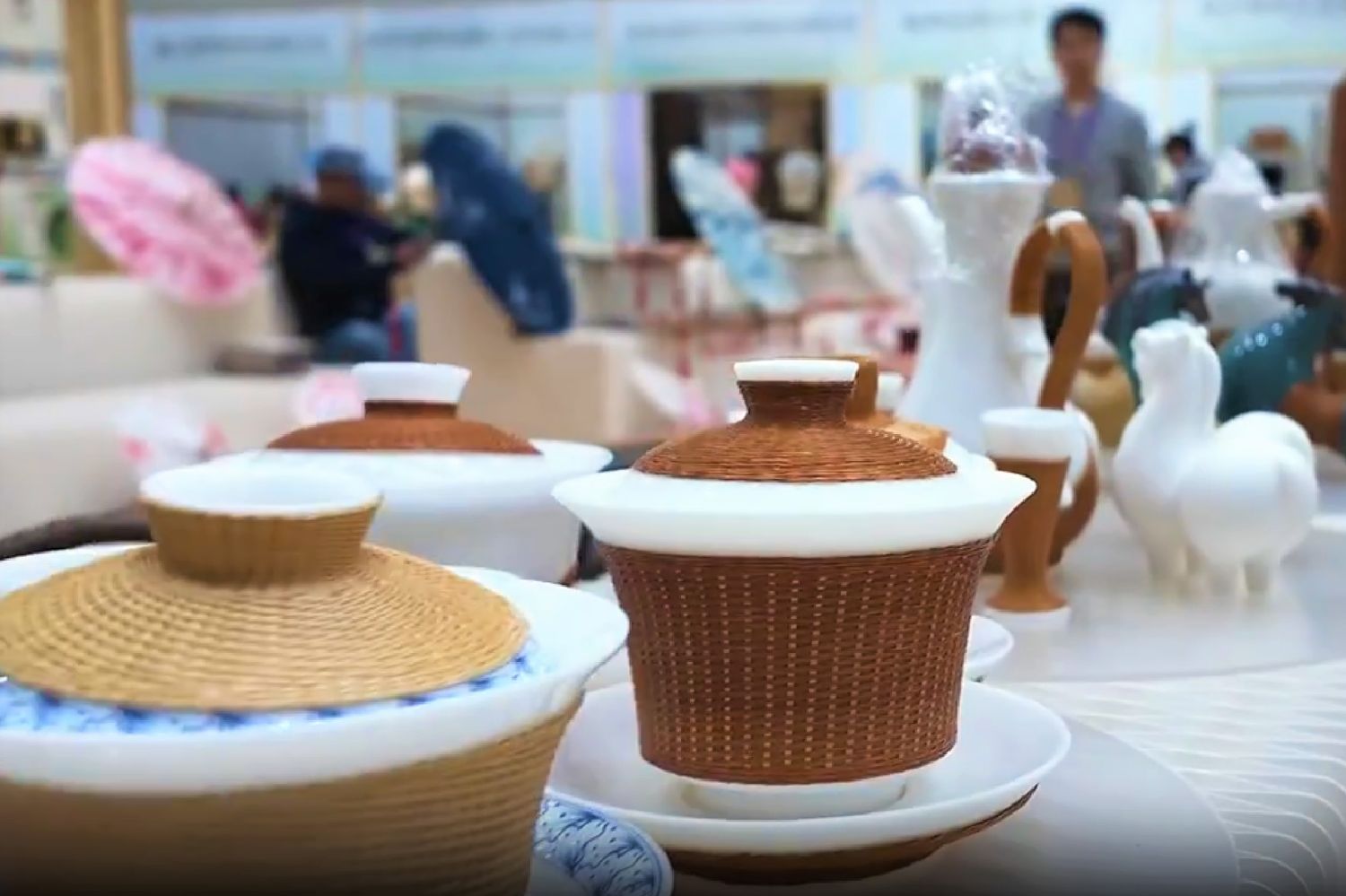 图为2024中国国际竹产业交易博览会现场的竹编茶具。(成都四川在线)