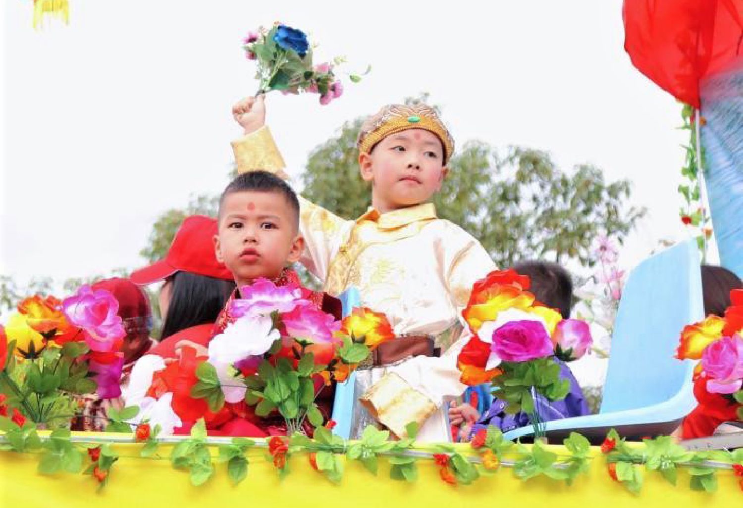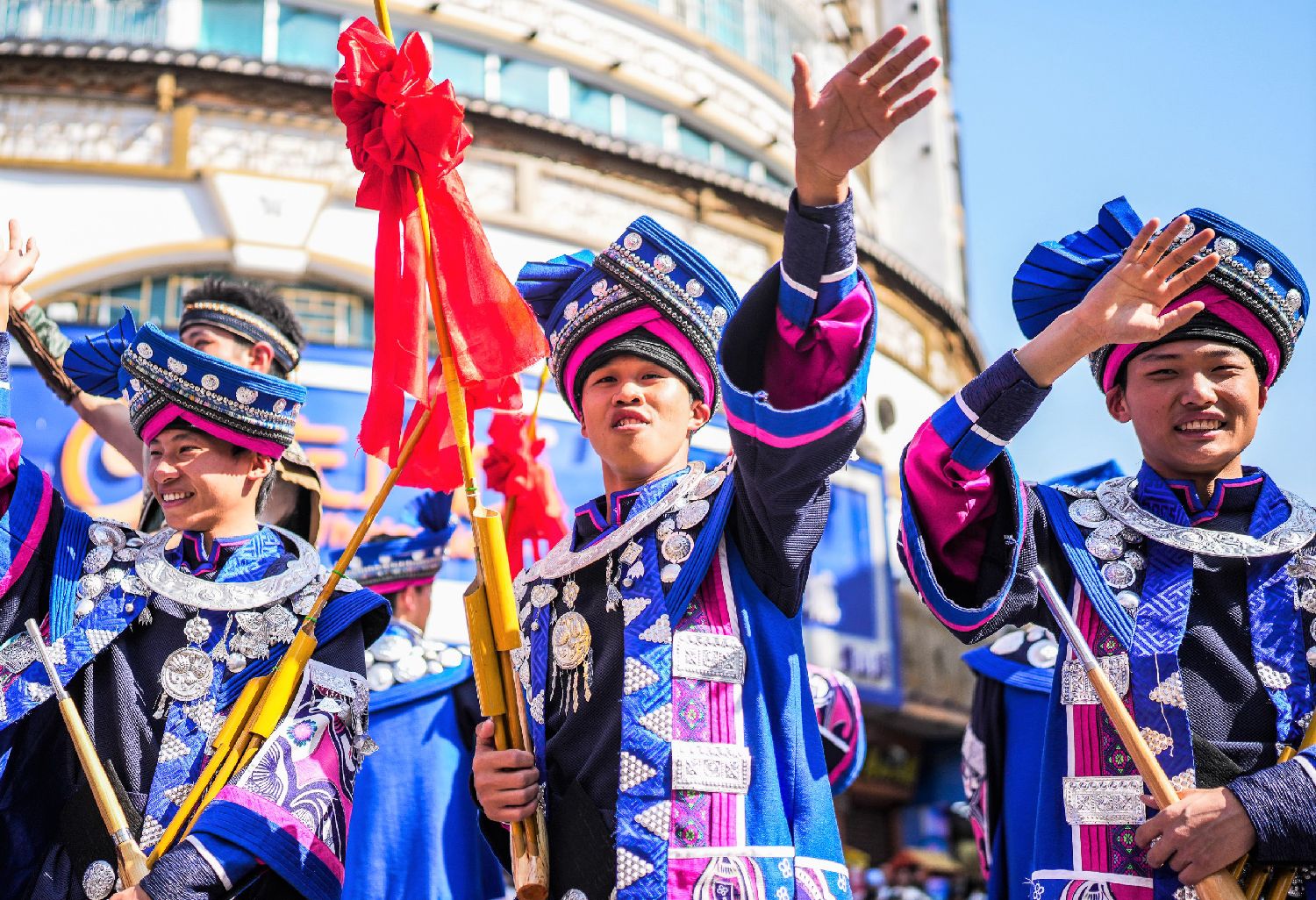 图为11月10日,贵州省黔东南苗族侗族自治州雷山县,身着盛装的苗族同胞参加花车巡游。(新华社)