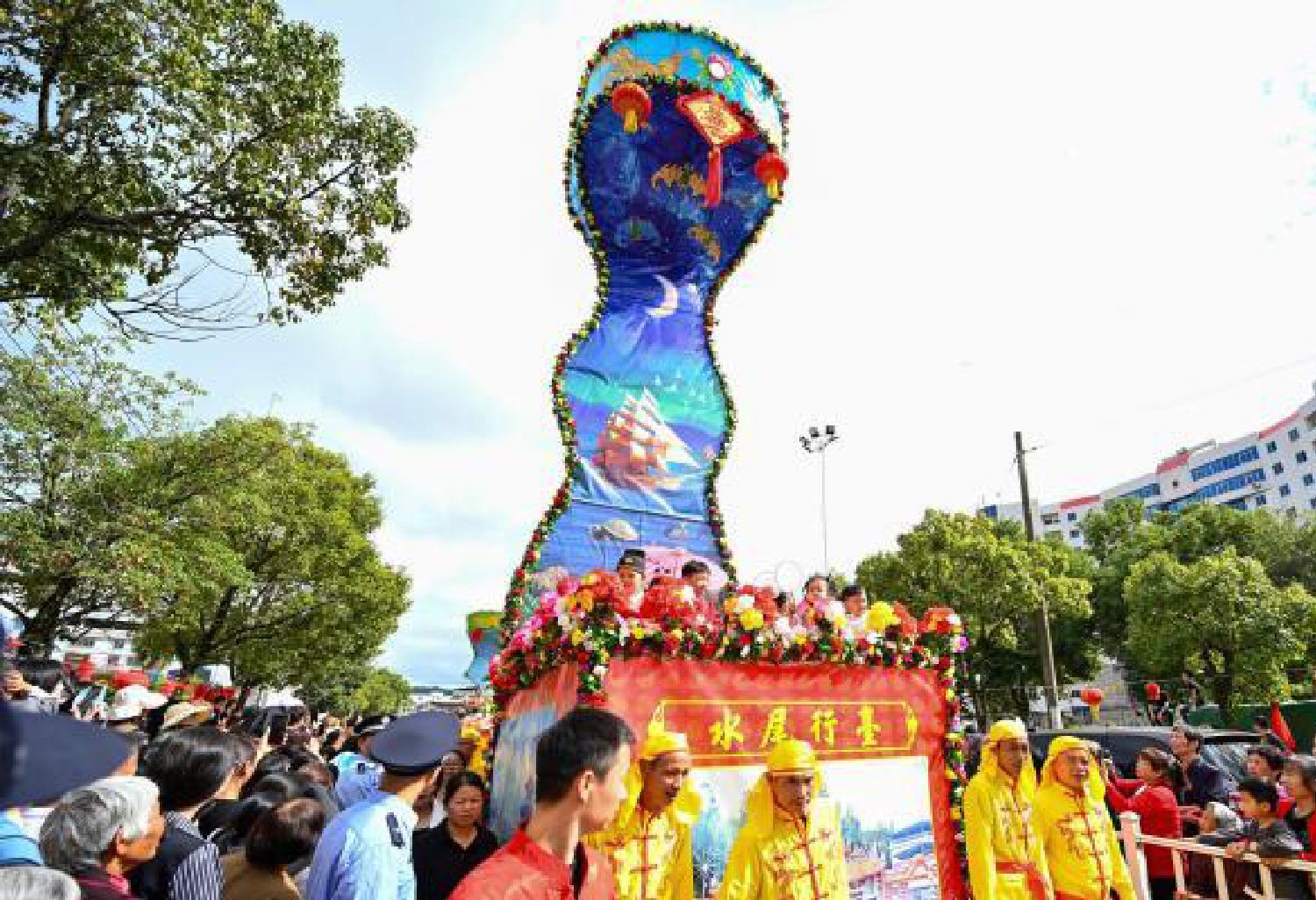 图为11月13日,福建龙岩,“盂兰盆”第58届盛会龙腾盛世踩街游行上独具特色的适中大台戏。(中新社)