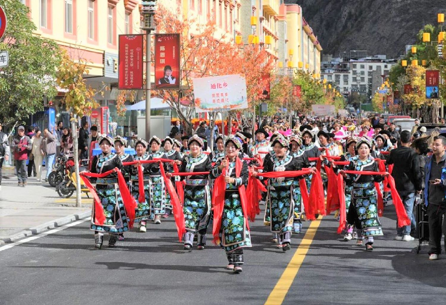 图为11月12日,四川省阿坝藏族羌族自治州理县举办“舞动理县 聆听岷江”2024年理县红叶温泉冰雪季原生态锅庄与民歌大赛活动,现场一支支锅庄队伍化身成巡游队伍。(成都四川新闻网)
