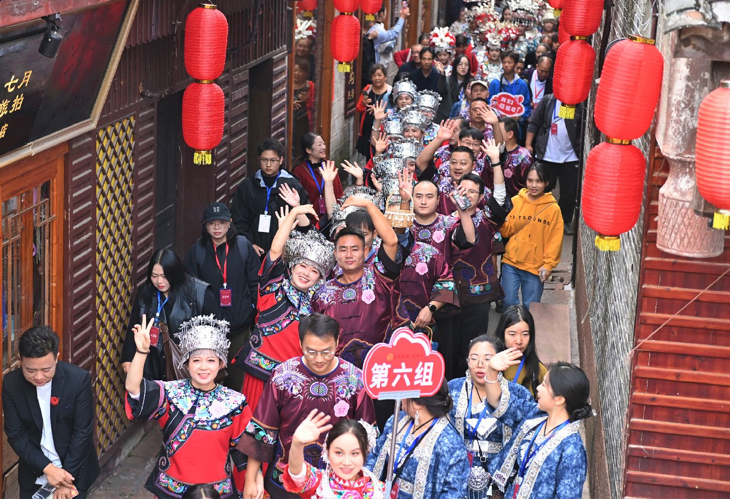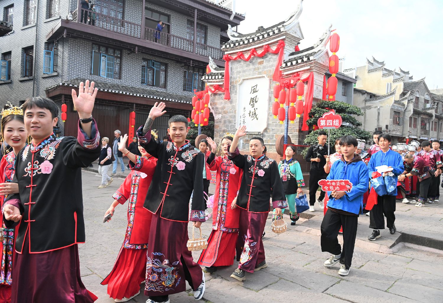 图为11月11日,湖南凤凰古城内新人在古城大街小巷巡游。(中新社)