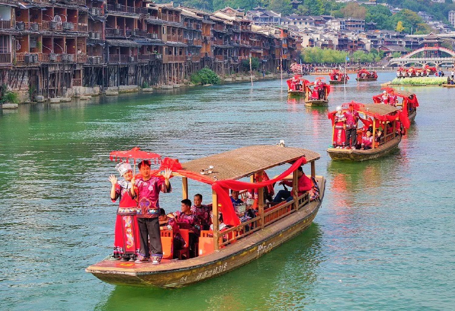 图为11月11日,百对新人乘坐游船在凤凰古城沱江上巡游。(长沙《湖南日报》)
