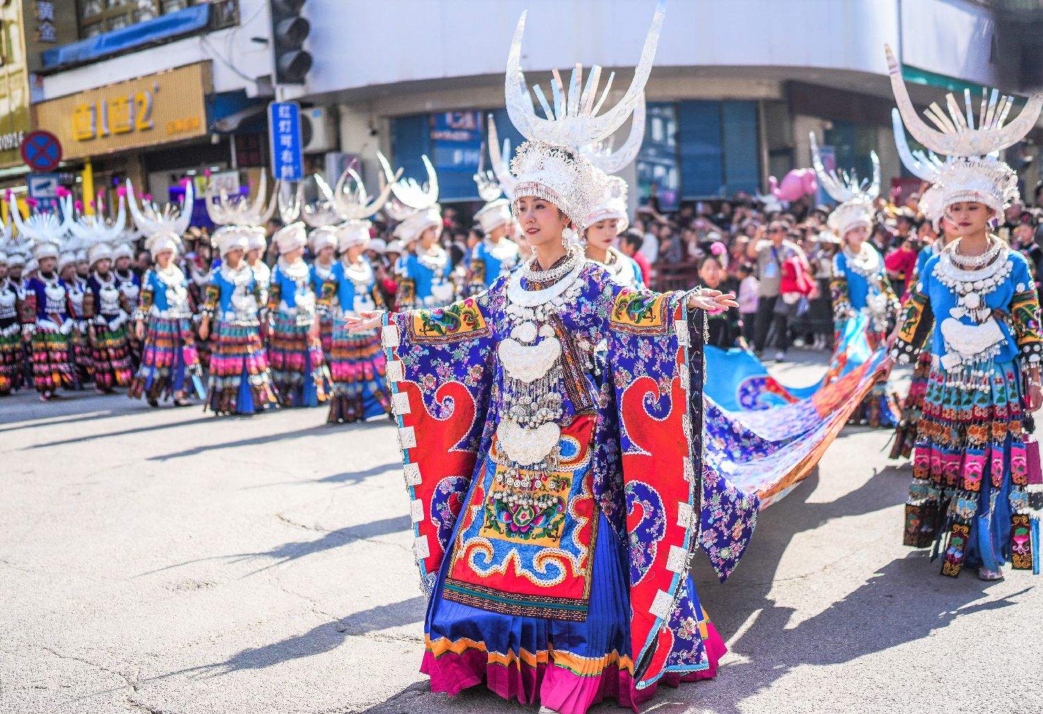 图为11月10日,贵州省黔东南苗族侗族自治州雷山县举行庆苗年活动,身着盛装的苗族同胞参加巡游活动。(新华社)