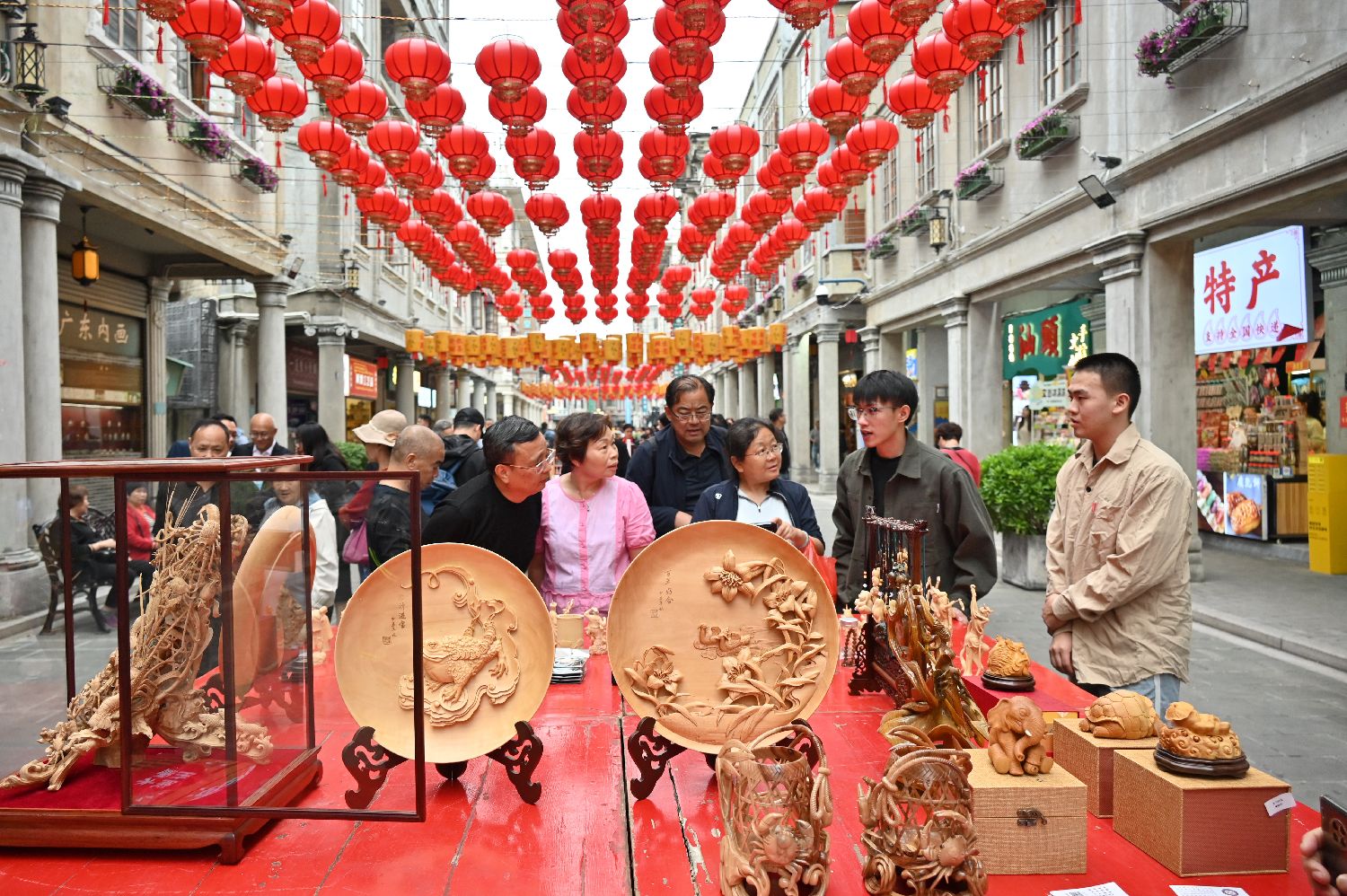 图为11月19日,广东汕头小公园历史文化街区展示的潮州木雕吸引游客。(中新社)