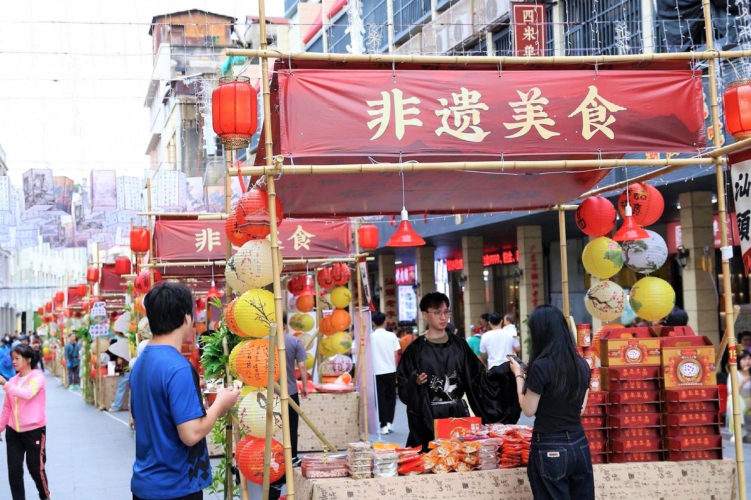 图为广东汕头,庙会所展示的牛肉、鹅肉等非遗美食。(中国网)