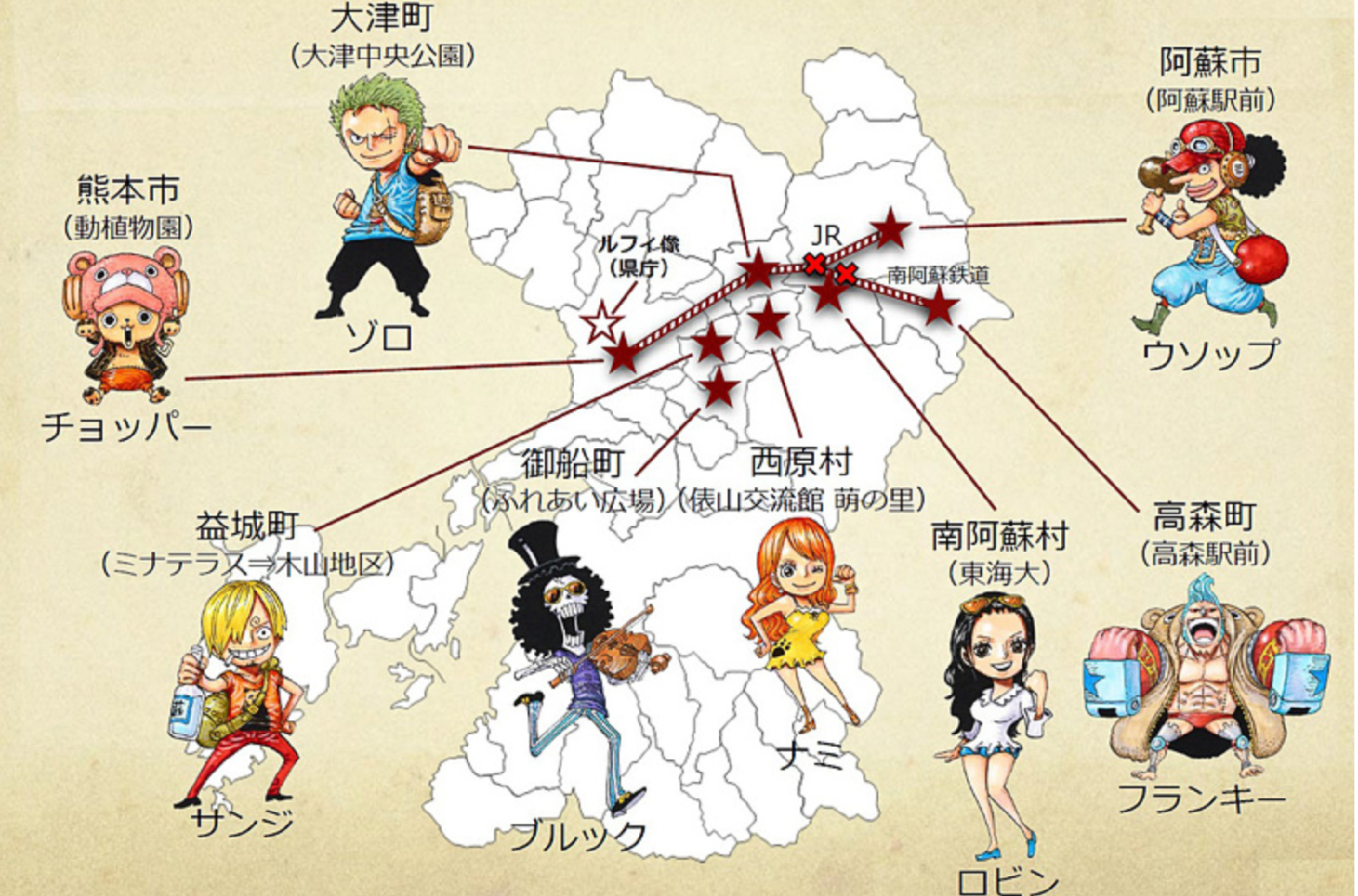 熊本县是《航海王》作者尾田荣一郎的家乡。在2016年熊本地震后,尾田先生与当地政府及出版社集英社合作,启动了“熊本复兴项目”。项目通过在县内多个受灾严重地区设立“草帽一伙”角色铜像,传递振兴和希望的信息。自2018年第一座路飞铜像在县政府前设立以来,四年间,共有10座铜像分布于县内各地,每座雕像还结合角色特点和当地故事展开情节设计。