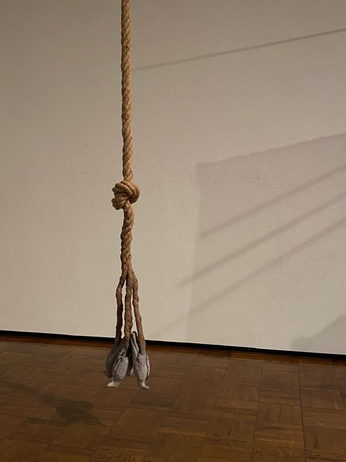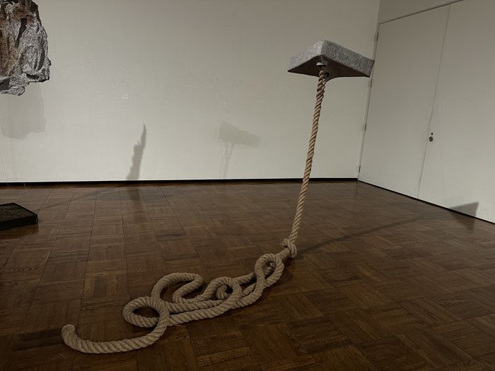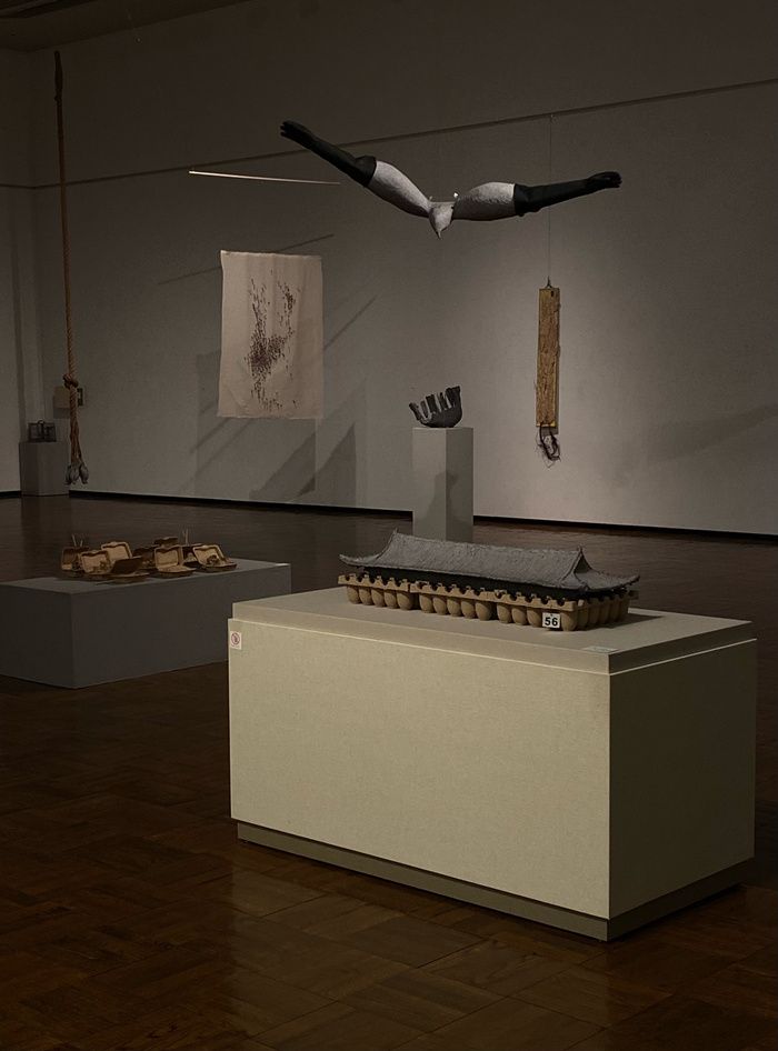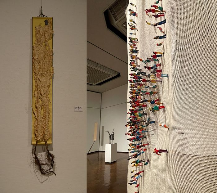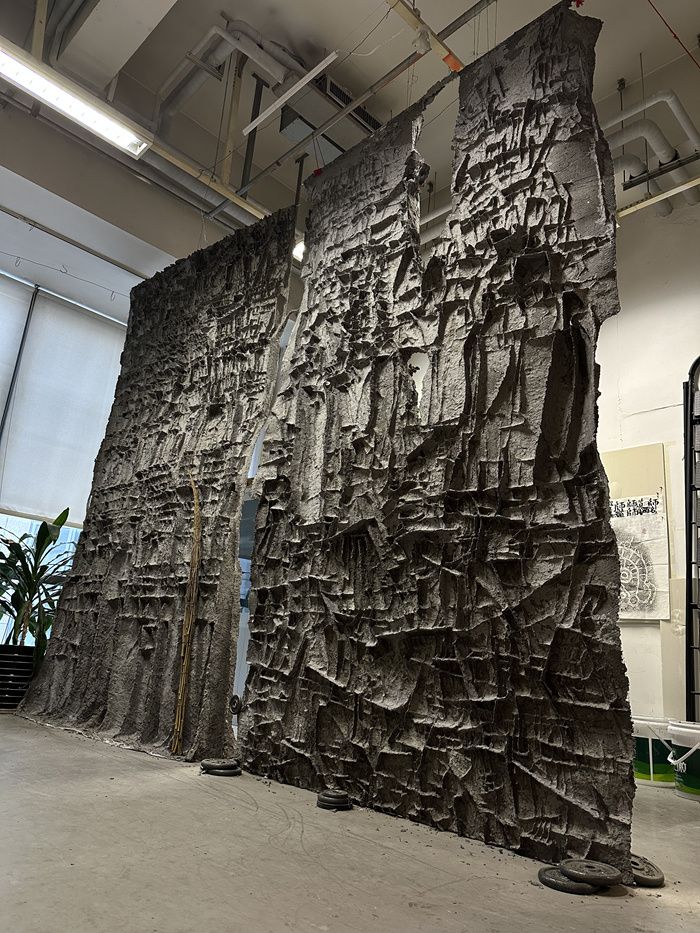 左:《内容消解》纸浆、卷轴160x5x20cm2024 右:《群对话》麻布、塑胶人模105x160x10cm2024