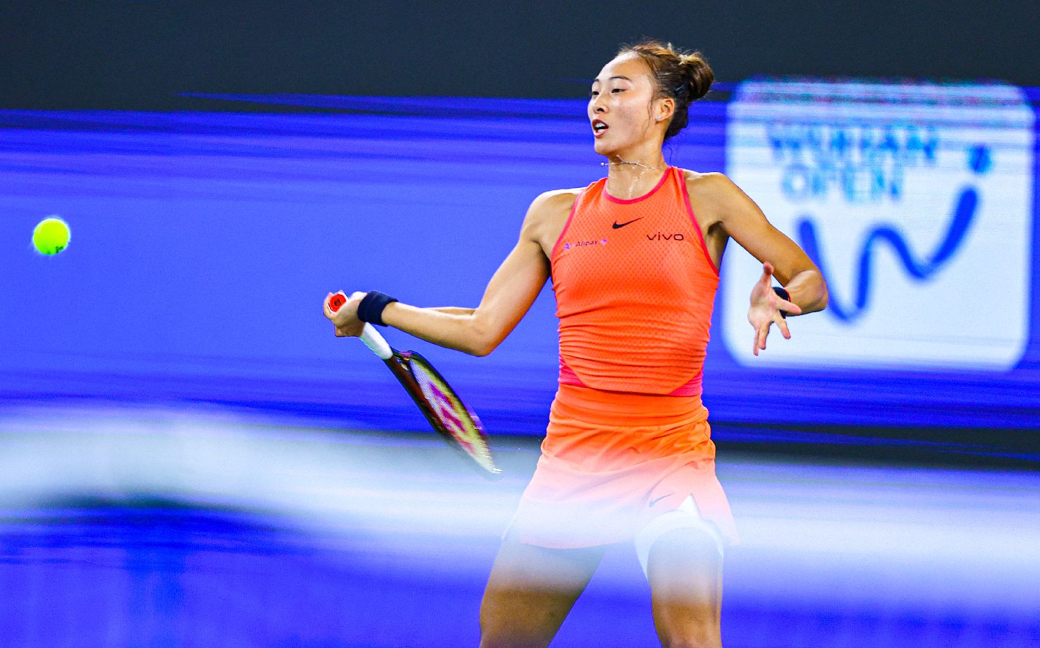 2024年10月13日,湖北武汉,2024年武汉网球公开赛展开女单决赛的争夺,中国选手郑钦文1比2不敌白俄罗斯选手萨巴伦卡获得女单亚军。图为郑钦文在比赛中回球。(图/中新社)