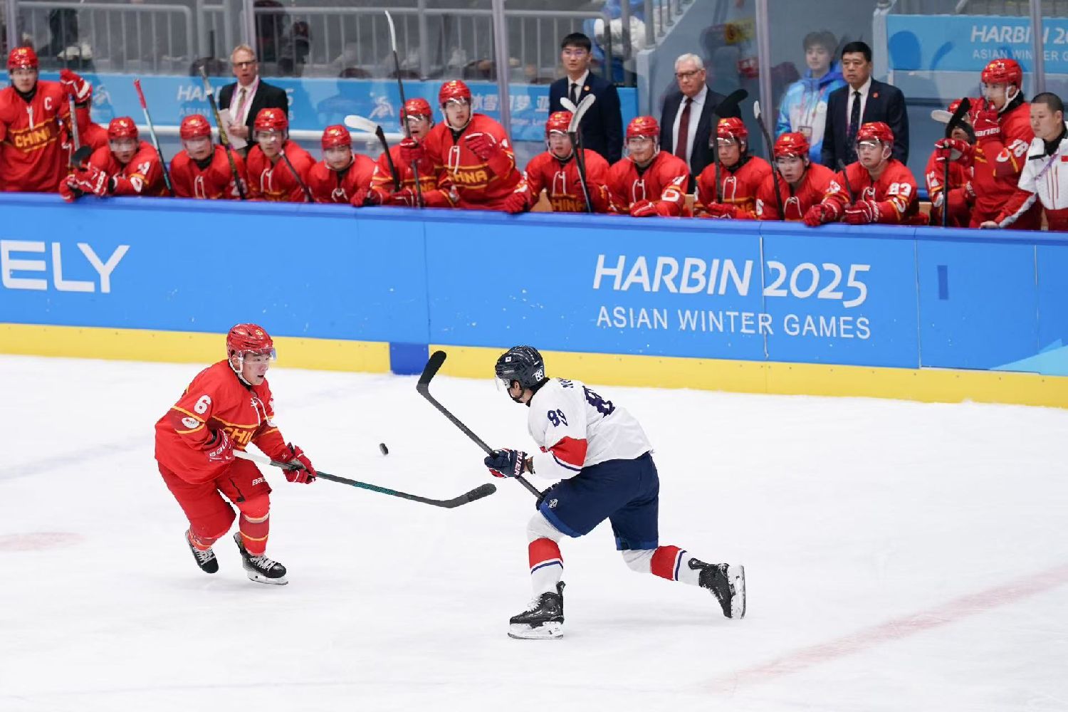 北京时间当晚进行的男子冰球A组比赛,中国队与韩国队战至加时赛,最终中国队以5:6憾负韩国队。首节开战,赛况即进入快节奏,韩国队率先发难破门得分。面对失分,中国队球员迅速调整状态,张嘉祺和闫俊丞先后攻破韩国队球门,以2:1结束首节比赛。