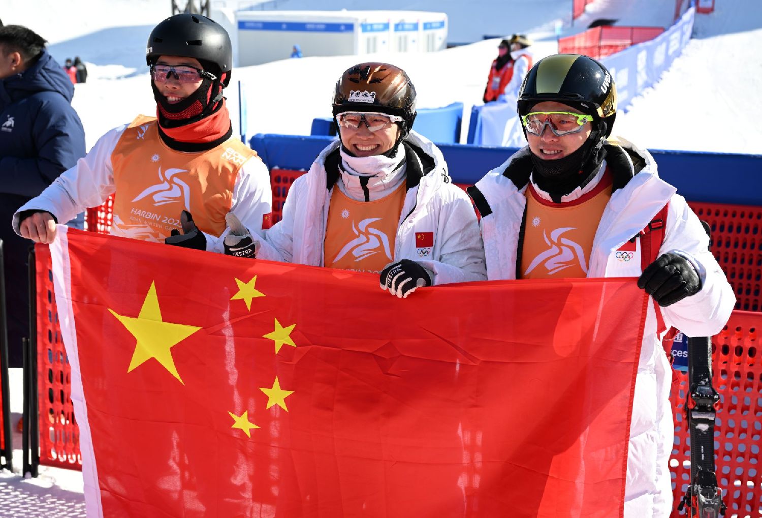 2月10日,在亚布力滑雪场举行的哈尔滨亚冬会自由式滑雪空中技巧混合团体决赛中,由徐梦桃、李心鹏、齐广璞组成的中国队以305.64分的总成绩获得金牌。图为徐梦桃(中)、李心鹏(左)、齐广璞赛后举起中国国旗。(图/中新社)