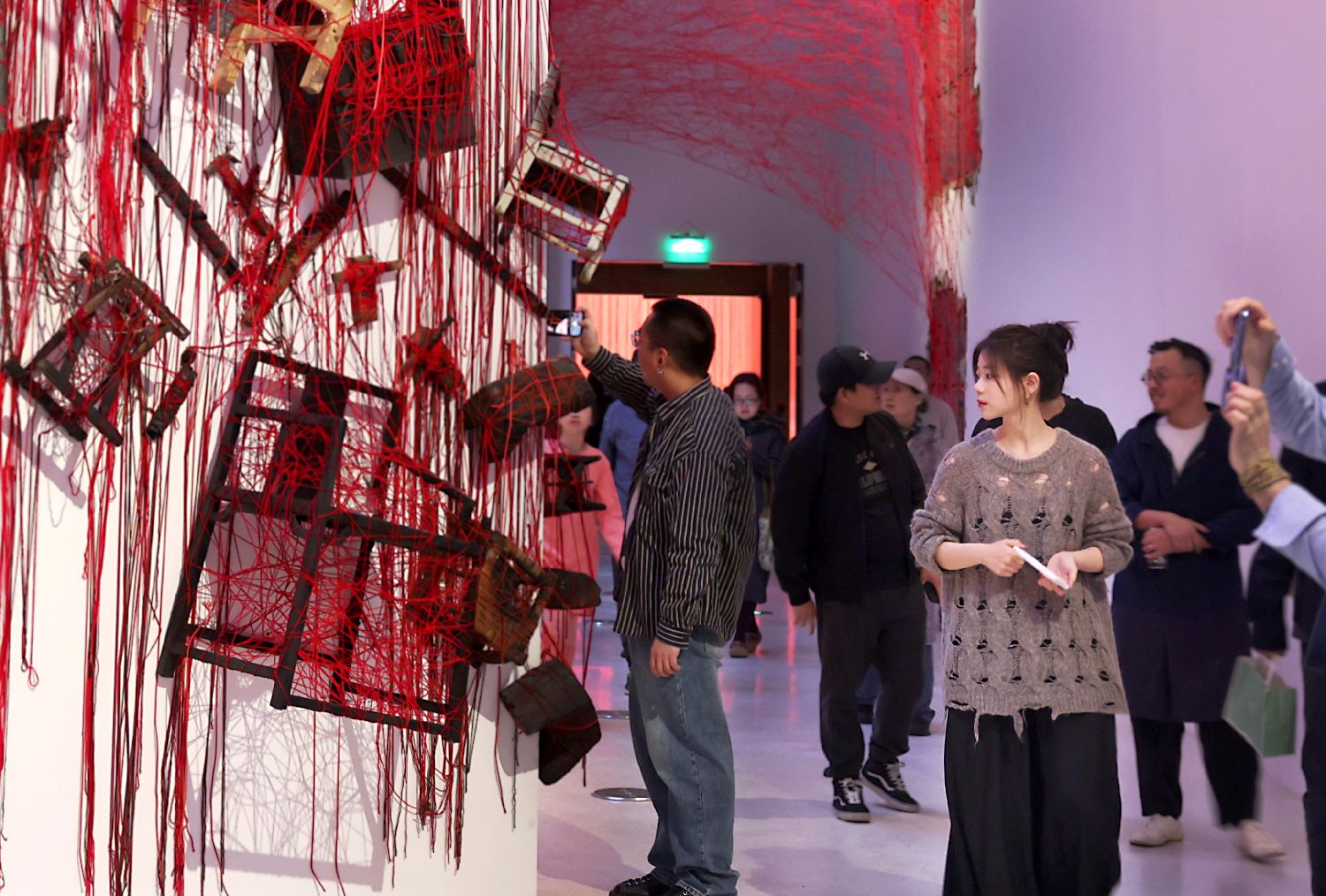 2025年3月22日,参观者置身日本艺术家盐田千春的装置作品中参观、留影。(卞亚文 摄)